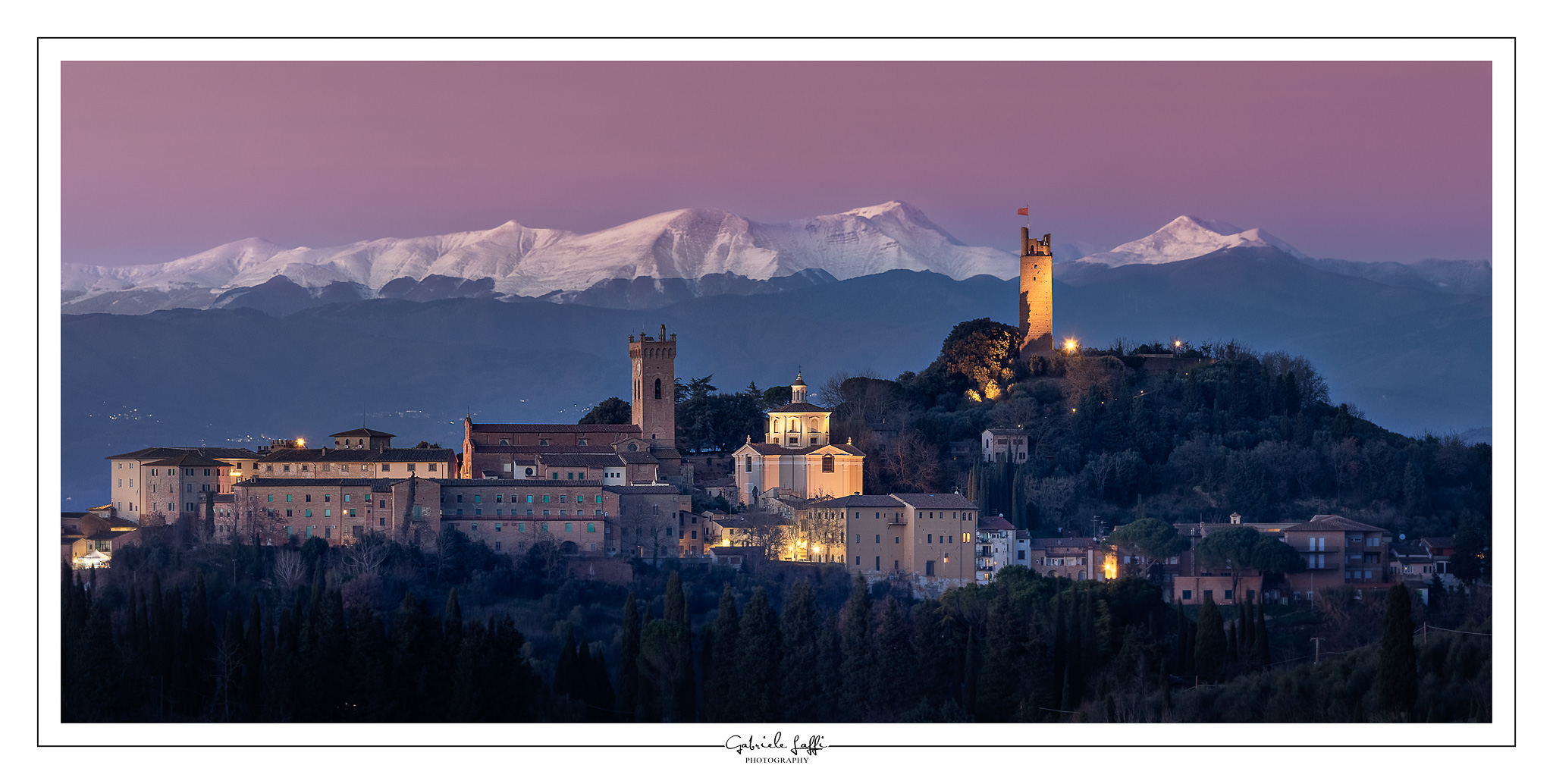Il contrasto tra il calore delle luci artificiali del borgo e il freddo glaciale delle cime innevate crea una profondità spaziale quasi irreale. San Miniato, situata a circa 150 metri sul livello del mare, sembra qui dialogare direttamente con le vette che sfiorano i 2000 metri, colmando visivamente la distanza geografica che separa la valle dell'Arno dalla dorsale appenninica.