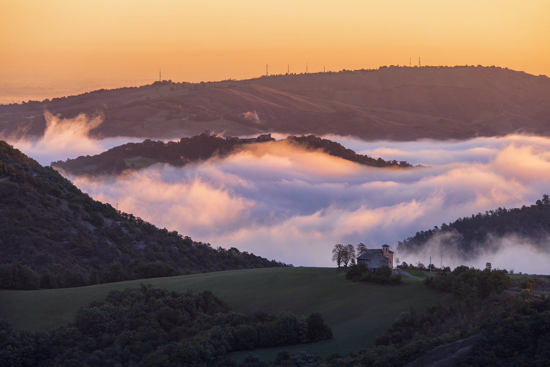 Una scena dominata da una spettacolare nebbia che riempie la zona di Viano. In primo piano, è visibile l'Oratorio di San Siro, un piccolo e affascinante edificio religioso, situato su un altopiano verdeggiante circondata da splendidi calanchi. Nonostante la sua dimensione contenuta, l'edificio ha una grande rilevanza storica e spirituale per gli abitanti della zona.