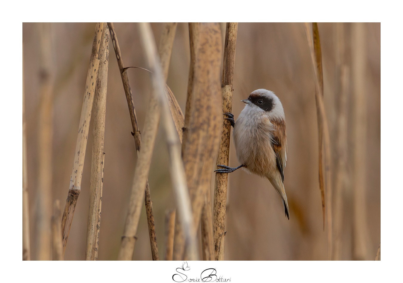 Siamo al cospetto di un bellissimo Pendolino Europeo (Remiz pendulinus). È un piccolo uccello passeriforme, lungo circa 10-11 cm. Ha un piumaggio soffice e un corpo arrotondato. La caratteristica più distintiva è la testa: ha il capo di un grigio-biancastro chiaro con una netta mascherina nera che attraversa l'occhio e si estende sui lati del capo. Il dorso e le spalle sono di un bel color marrone castano/rossiccio, mentre le parti inferiori sono più chiare, beige o crema. Il becco è sottile e appuntito.