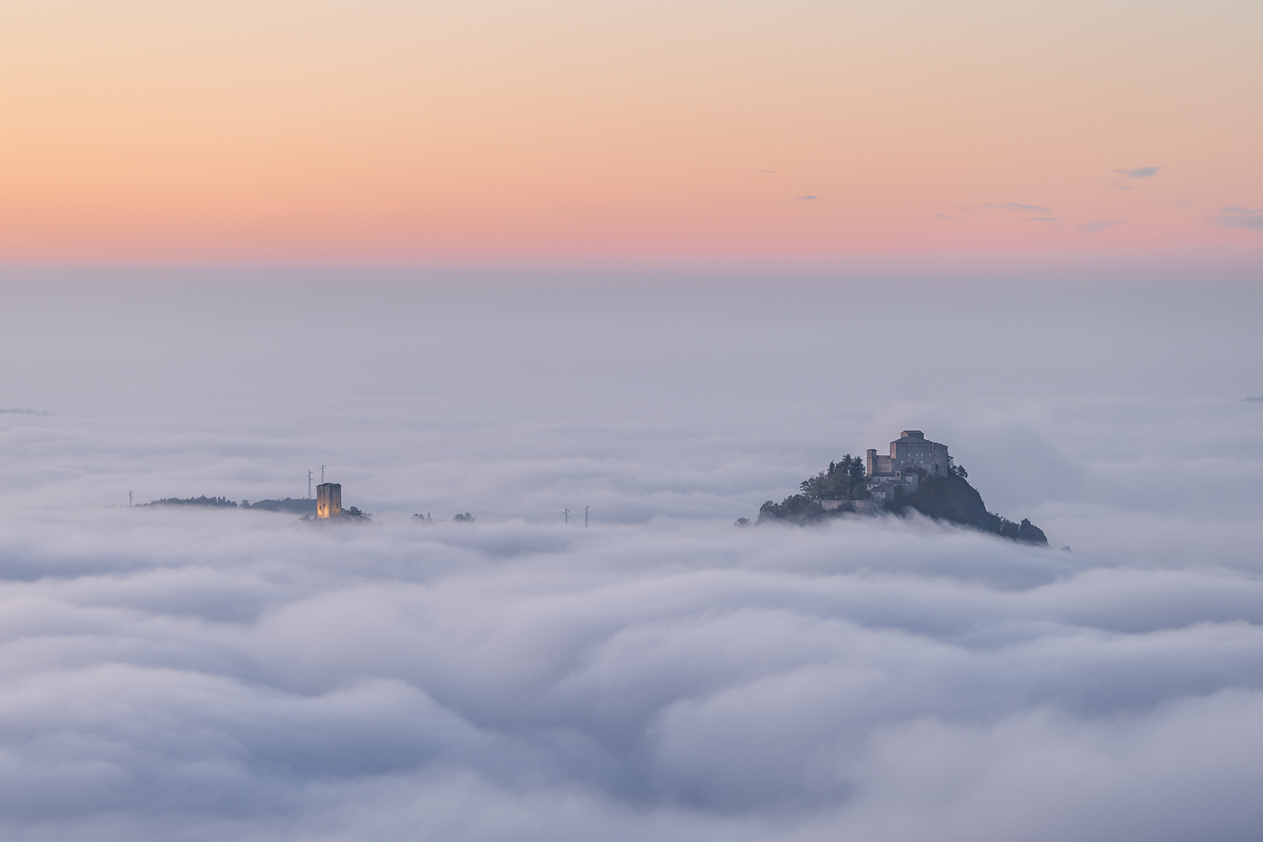 Ancora un prodigio di Andrea Frassinetti che ha approfittato al meglio del tappeto di nebbia che si estende da giorni nel catino Padano. Un mare di nuvole dal quale spuntano giusto le due fortificazioni matildiche di Rossena e Rossenella.