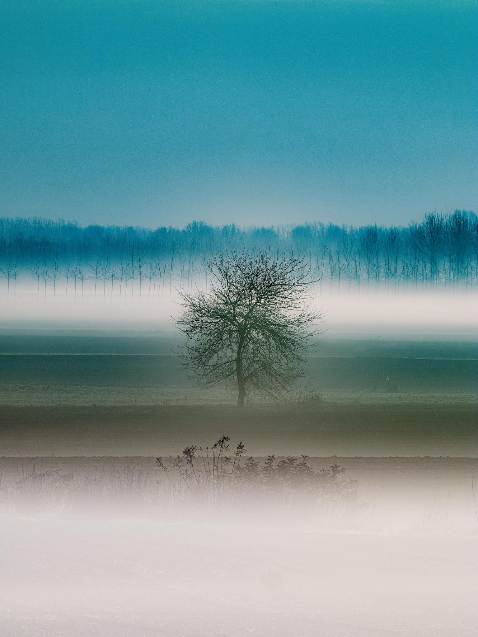 Tornando allo scatto, invece, l'atmosfera cattura la transizione tra notte e giorno, esaltata dal contrasto tra il bianco della nebbia e il cielo che vira verso toni azzurri e verdi. Queste condizioni sono tipiche delle zone di pianura, soprattutto in aree umide come quelle della Pianura Padana, dove la presenza di corsi d'acqua e temperature notturne basse favoriscono la formazione della nebbia al suolo.