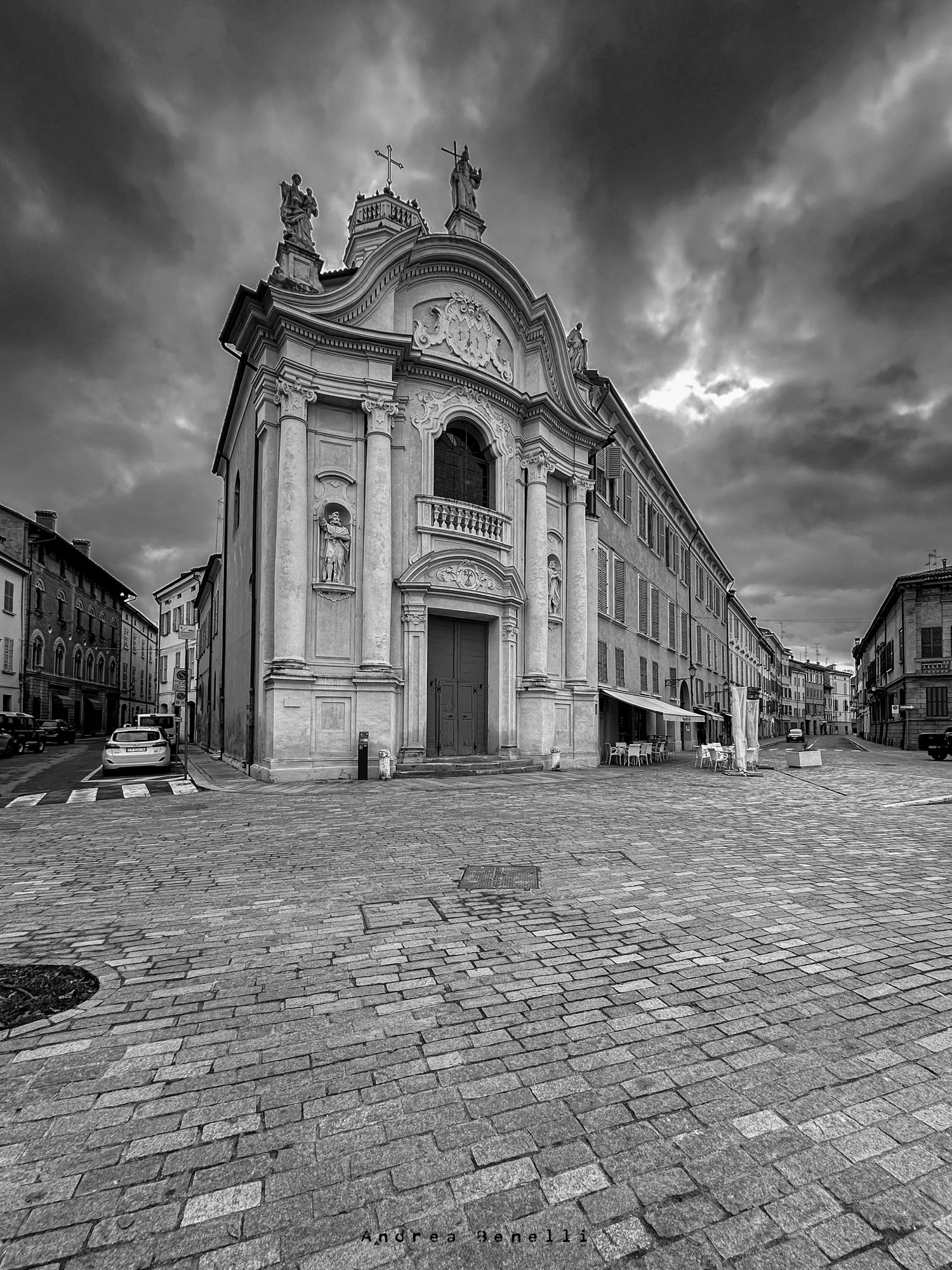 Torniamo nell'esagono della nostra Città per andare alla scoperta di Piazza Luigi Roversi e della bellissima chiesa del Cristo con questo scatto in bianco e nero di Andrea Benelli.