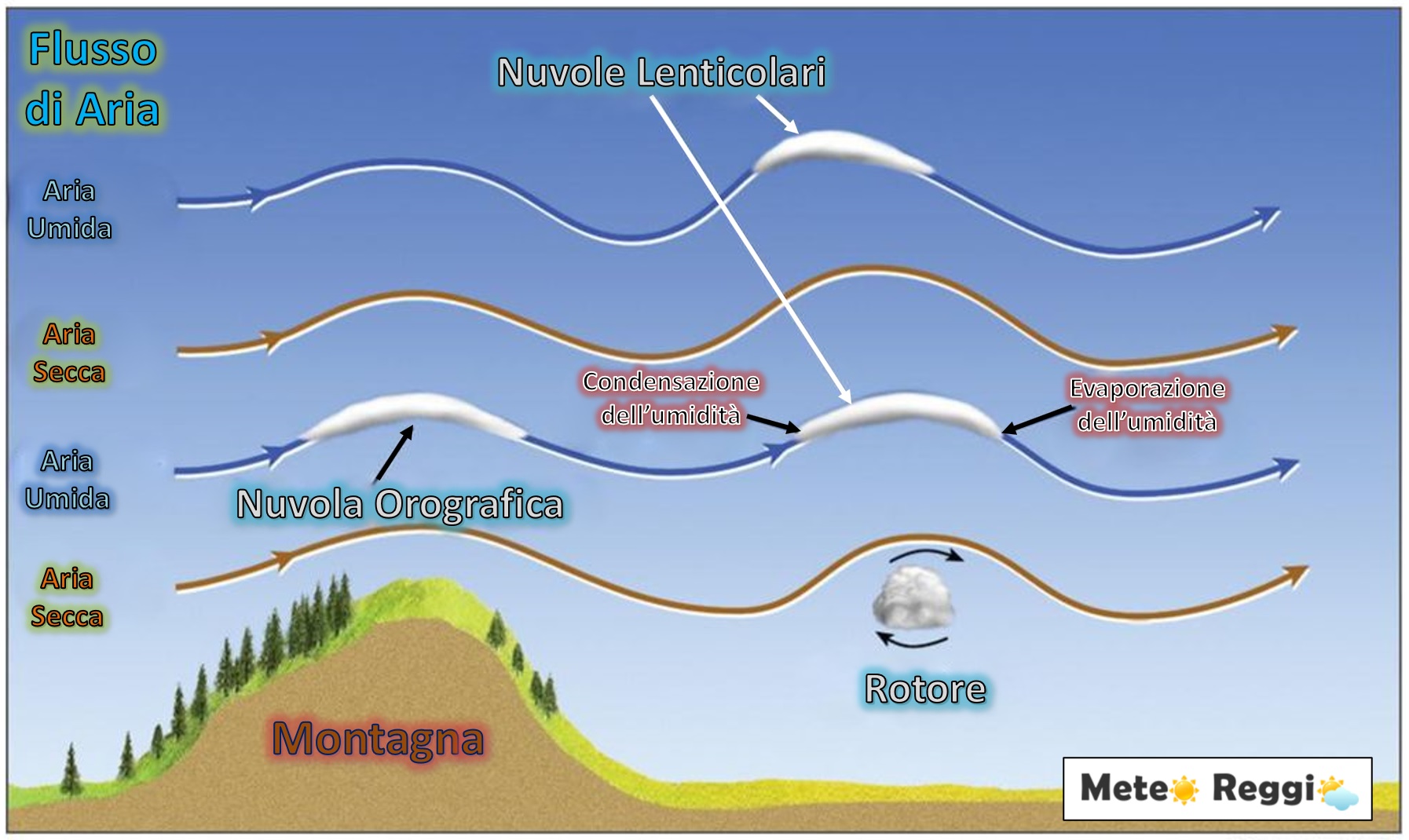 La presenza di vento forte e costante in quota è essenziale per sostenere le onde e la formazione delle nuvole su più livelli.