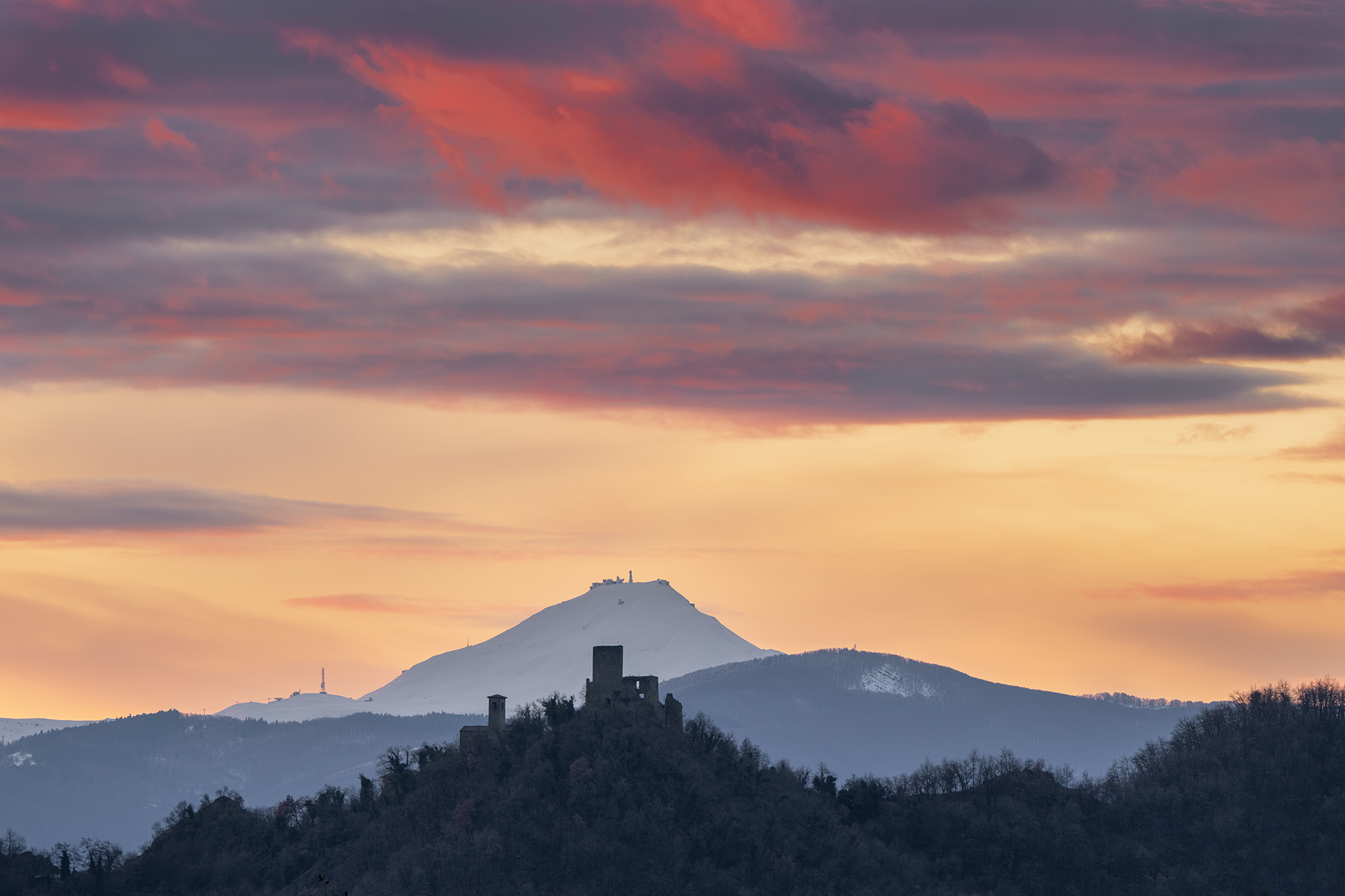 Ancora un gioco di prospettive con questo scatto di Andrea Frassinetti che in una sola immagine riesce ad incastonare il medioevo con la modernità dell'Osservatorio meteorologico del monte Cimone.