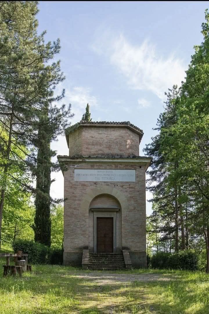 Realizzato in mattoni a vista, si inserisce perfettamente nel paesaggio boschivo che lo circonda. La forma ottagonale richiama la tradizione classica, simbolo di equilibrio e perfezione. Una lapide marmorea sulla facciata riporta un’iscrizione latina che omaggia Petrarca e il suo amore per la natura e il paesaggio.