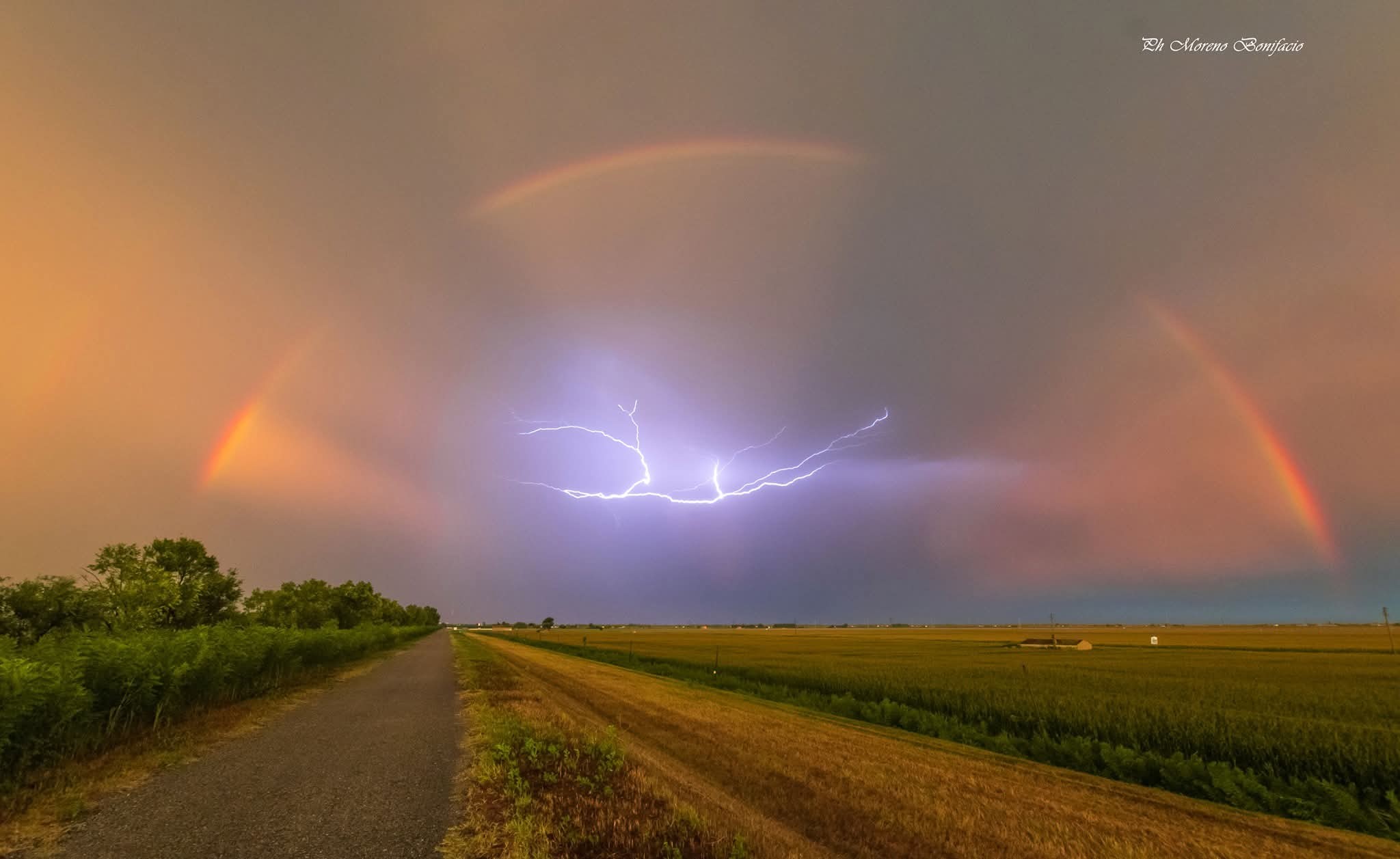 La Pianura del Delta del Po, con i suoi ampi orizzonti e la totale assenza di rilievi, offre un palcoscenico perfetto per osservare questi fenomeni: qui lo sguardo può abbracciare contemporaneamente temporali lontani e aree illuminate dal Sole, amplificando la probabilità di catturare eventi rari. Questa fotografia non è solo un documento meteorologico eccezionale, ma anche una testimonianza della bellezza imprevedibile della natura, capace di unire in un’unica scena la potenza del fulmine e la delicatezza di un arcobaleno. E che dire dei raggi crepuscolari che spezzano l'arcobaleno?