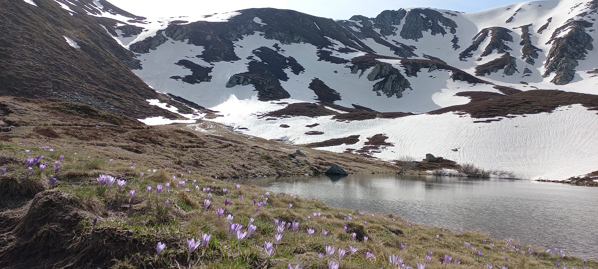 La situazione attuale in vetta è ben testimoniata da questo scatto di Manuel Cavecchi sulle sponde del lago della Bargetana, dove in questo periodo fioriscono abbondanti i Crochi.