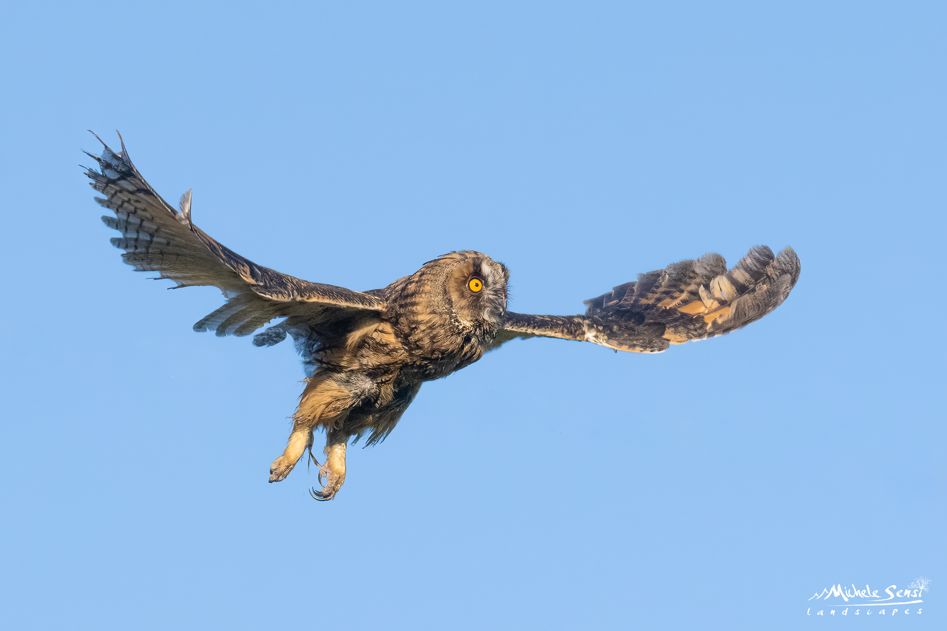 L'esemplare in quesitone è uno splendido Gufo comune (Asio otus), dallo sguardo profondo del suo tipico colore giallo/arancione, uno sguardo fisso che però non cambia mai di direzione. Per tale ragione è in grado di girare la sua testa di circa 270° per potersi guardare intorno.