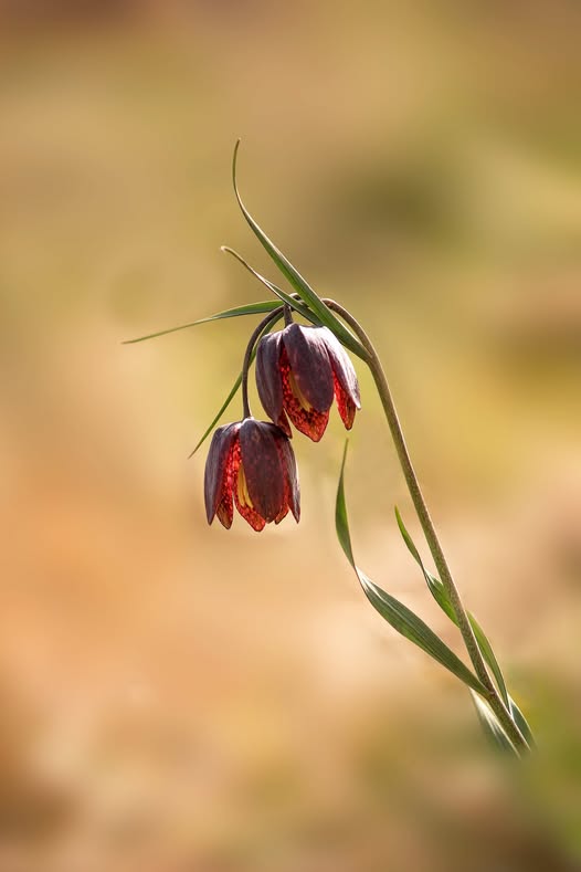 Presenta un fusto sottile, alto circa 10–40 cm, gracile ma eretto. Ha foglie lineari, strette e filiformi, disposte lungo il fusto in modo sparso. Se parliamo dei fiori, questi si possono presentare solitari o in coppia, penduli, di colore marrone-porpora o bruno-violaceo, spesso con screziature interne più chiare. A differenza della ben più nota Fritillaria meleagris, qui la caratteristica “scacchiera” è meno evidente, e la forma è più sottile ed elegante.