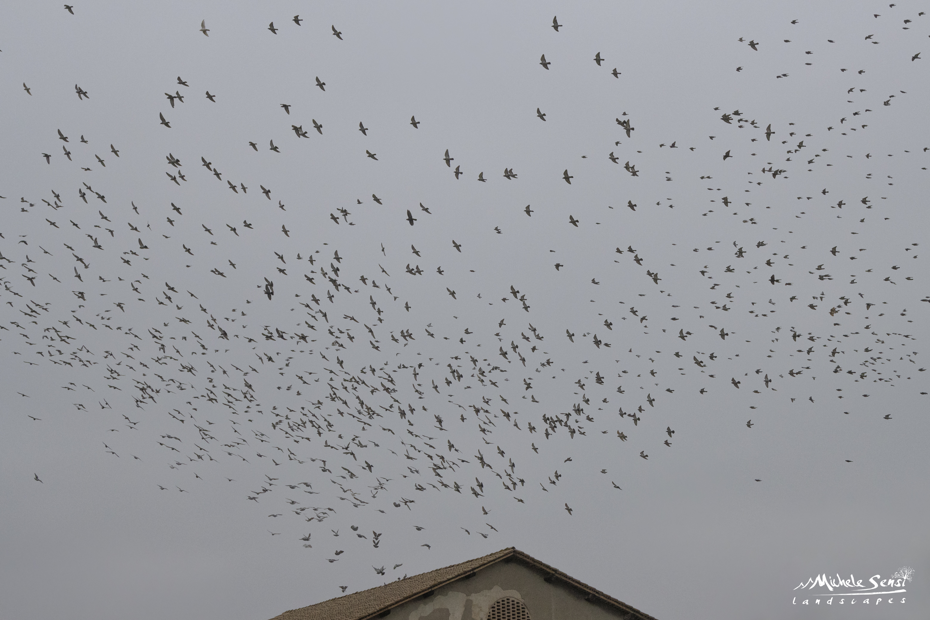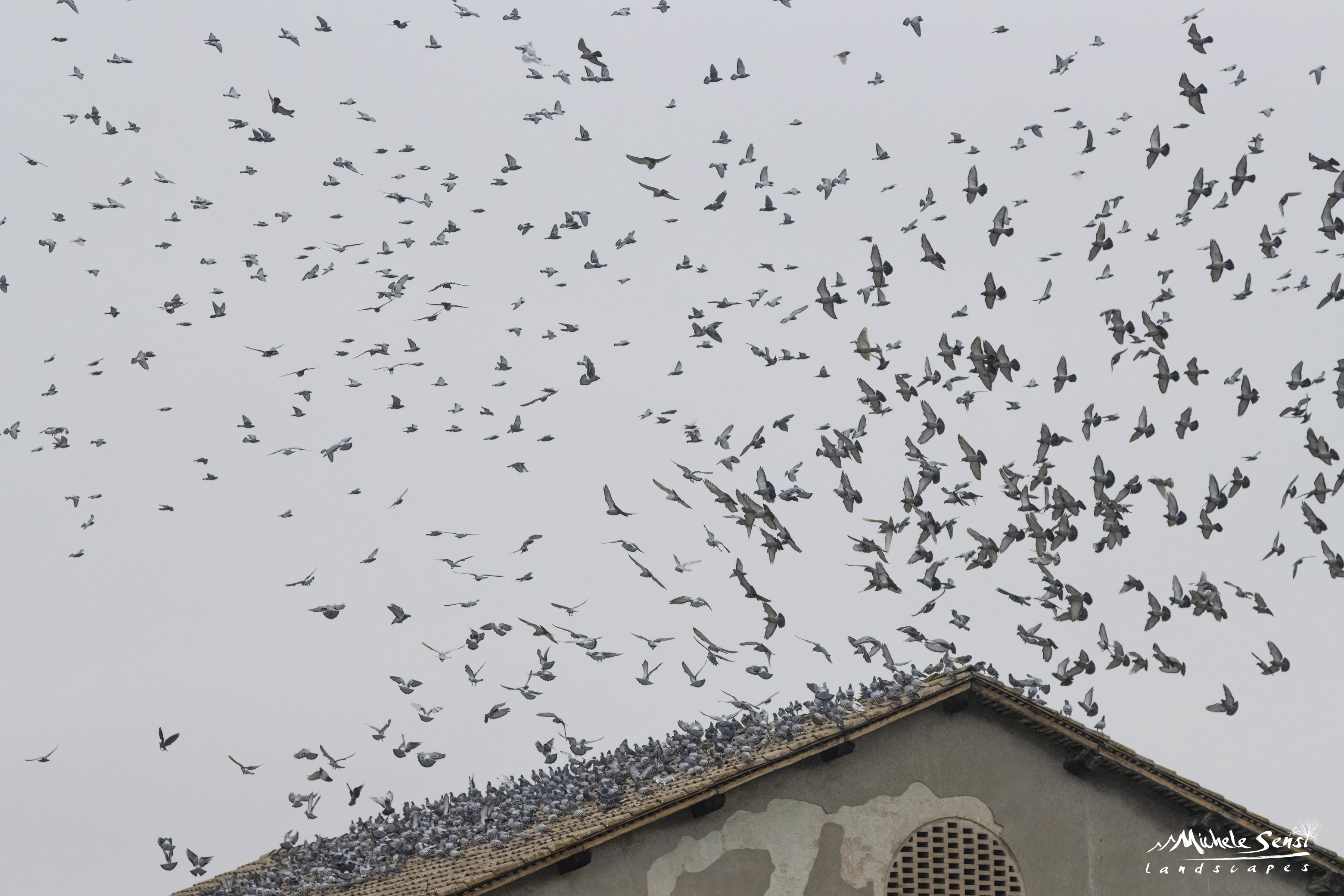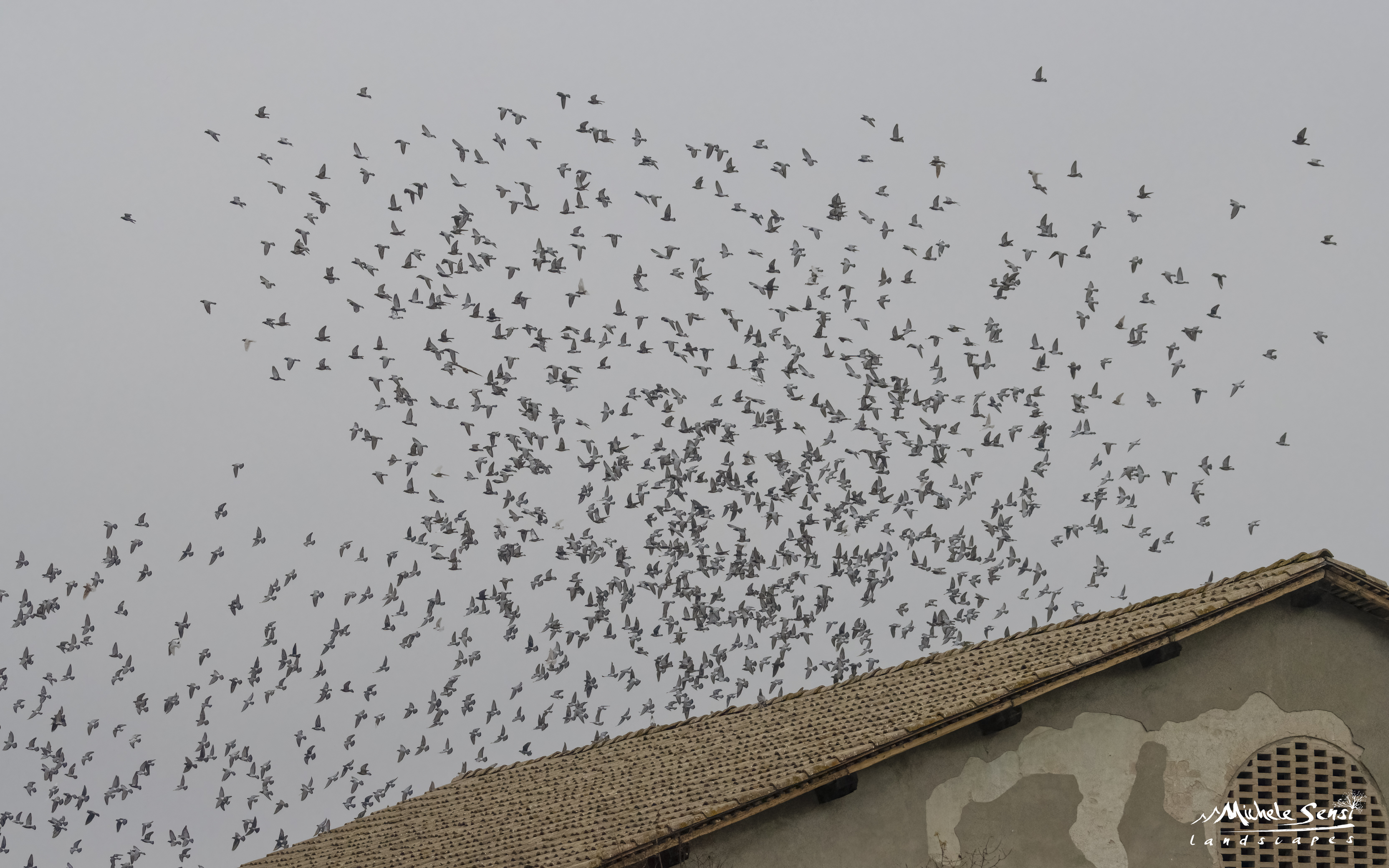 Queste immagini le abbiamo catturate pochi giorni fa nella campagna del comprensorio ceramico. In vita nostra non avevamo mai visto un'aggregazione di Piccioni così importante. Abbiamo visto questo stormo di migliaia d'individui compiere evoluzioni sincrone stupende, che avrebbero fatto impallidire i ben più performati Storni.