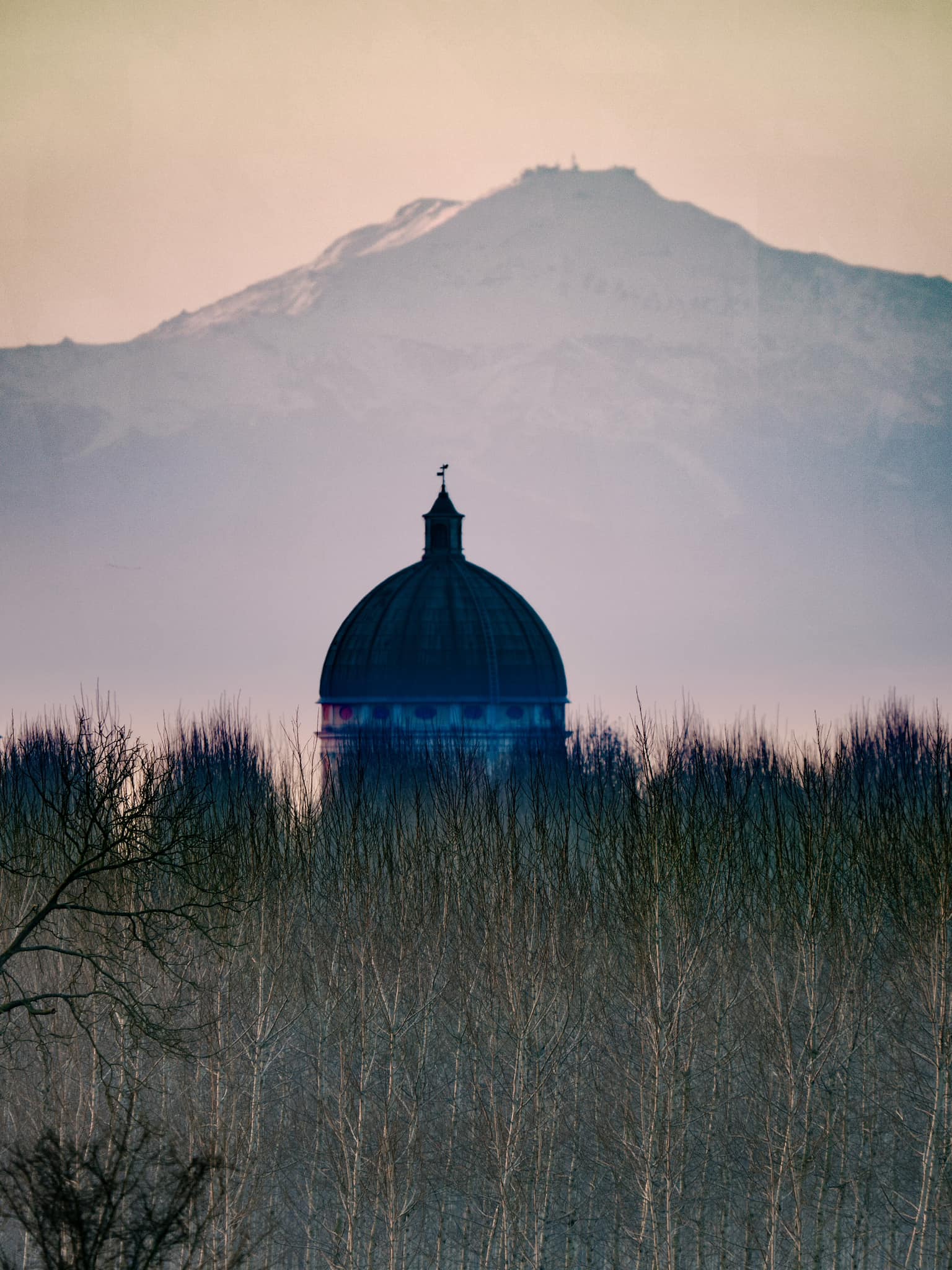 La foto del giorno di oggi è un bel concentrato di diverse tematiche tutte in uno scatto e l'autore di questa suggestione è Paolo Belloni, che da Viadana ha ripreso l'altissimo monte Cimone con una bellissima cupola della basilica di San Marco a Boretto.