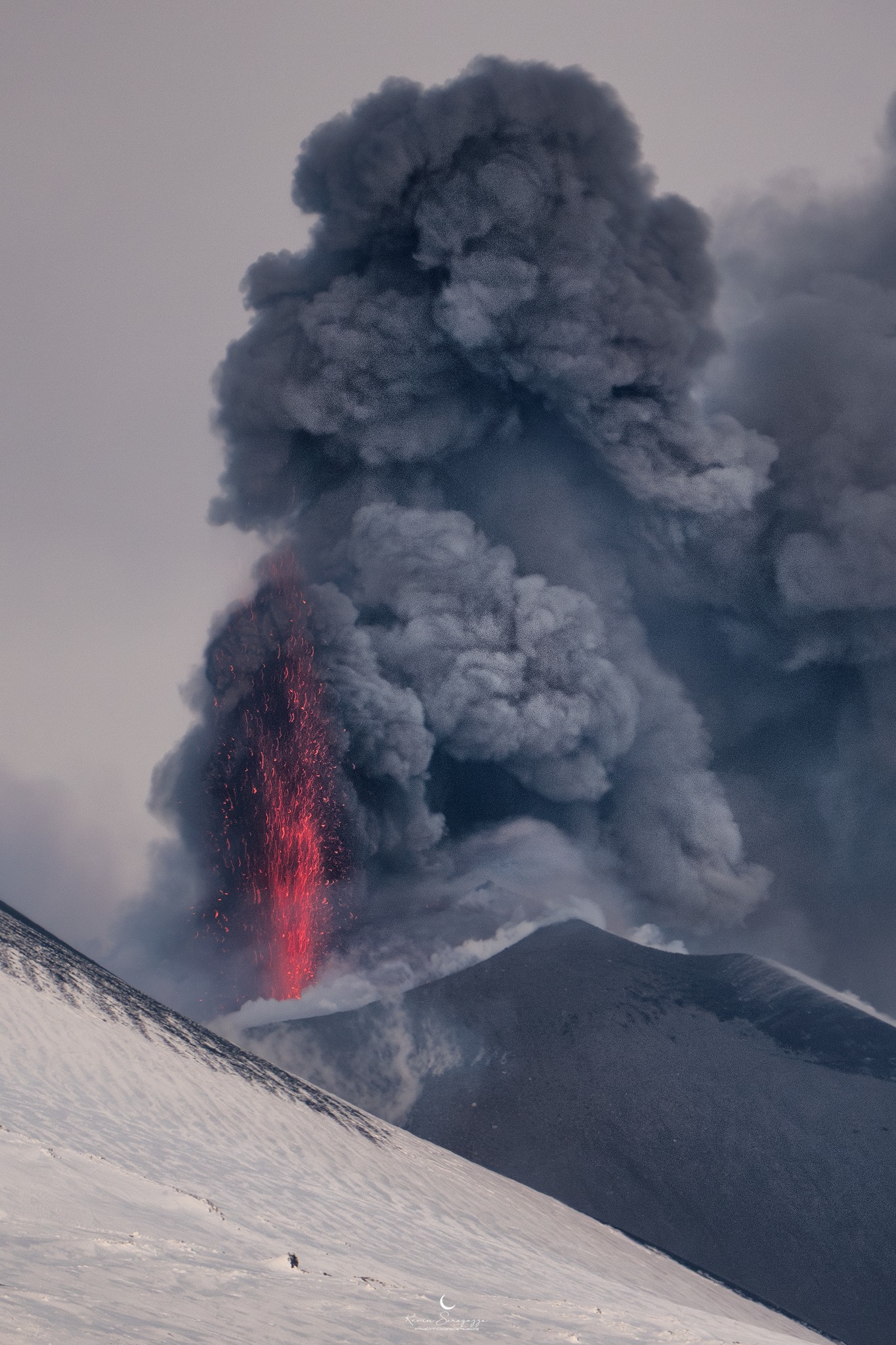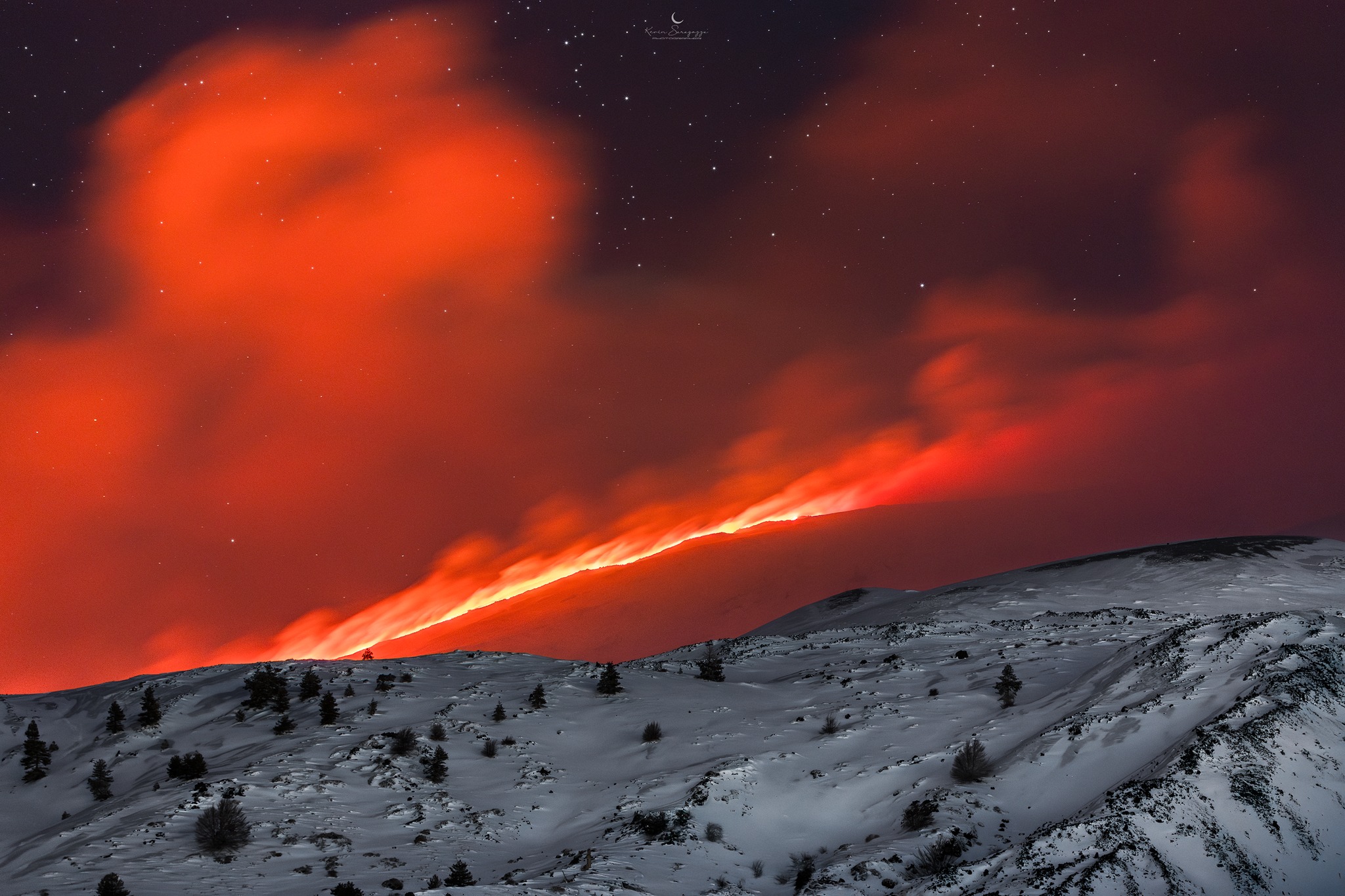 Oggi... alla faccia della gita fuori porta, ma non avendo vulcani sul nostro territorio dobbiamo andare a cercarli lontano e in questi giorni sta facendo bella mostra di sé il vulcano Etna. Vulcano talmente alto da potersi permettere la neve, proprio come ci mostra in questi strepitosi scatti serali Kevin Saragozza.
