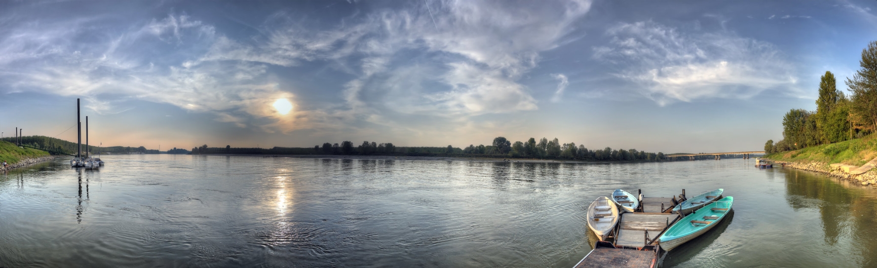 Una panoramica al tramonto da Lido Po a Guastalla. Un tramonto a specchio tra diversi Cirri nel cielo.
