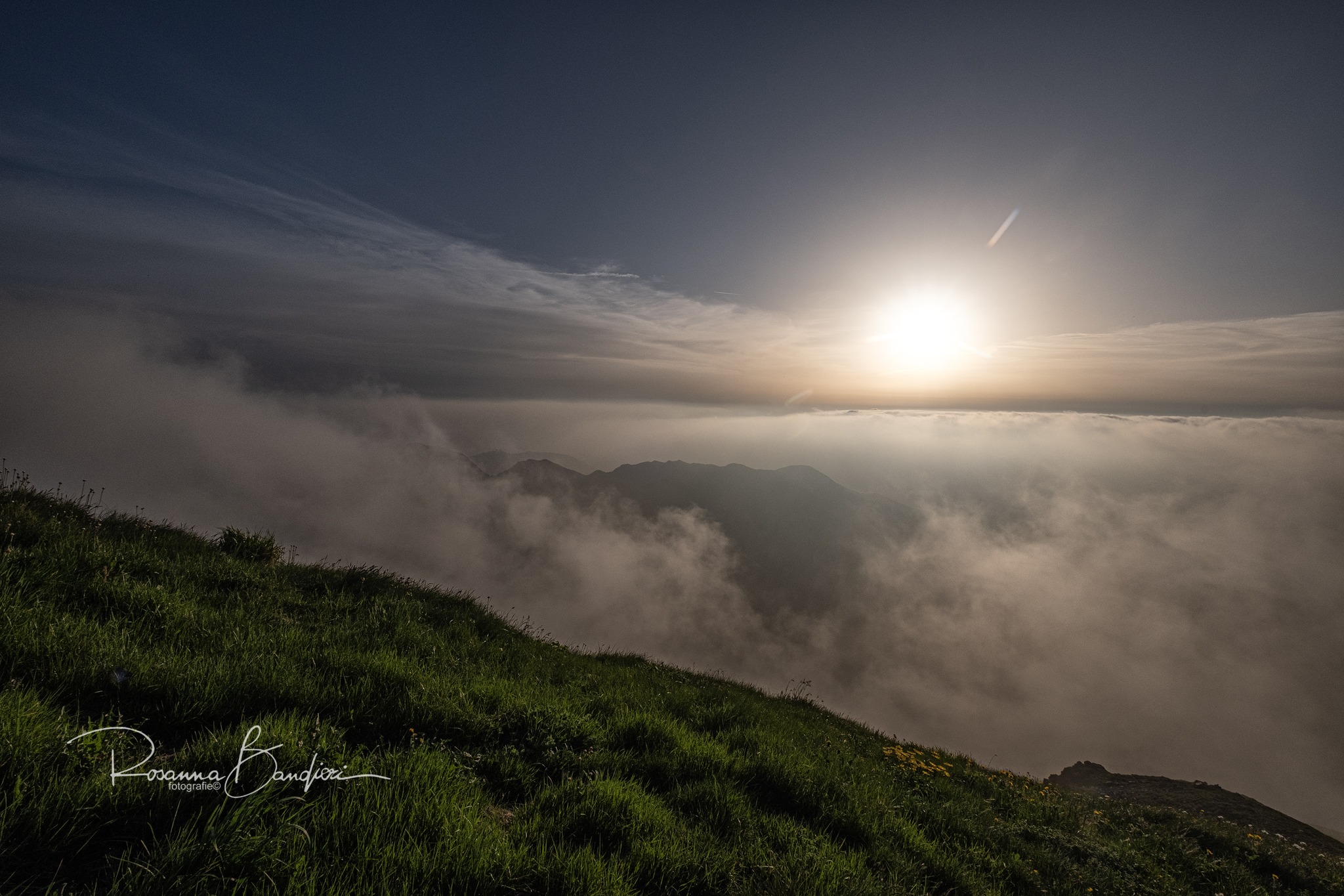 Ancora una suggestione fiabesca catturata da chi quelle cime le conosce come le proprie tasche, parliamo di Rosanna Bandieri che dall'alto dell'Alpe di Succiso tocca e fora le nuvole presenti contro il Crinale. Uno scatto in grande contrapposizione rispetto ai 36°C che quel giorno venivano toccati in Pianura sotto una cappa di fumi da incendi del Canada e qualche granello di polvere del deserto.