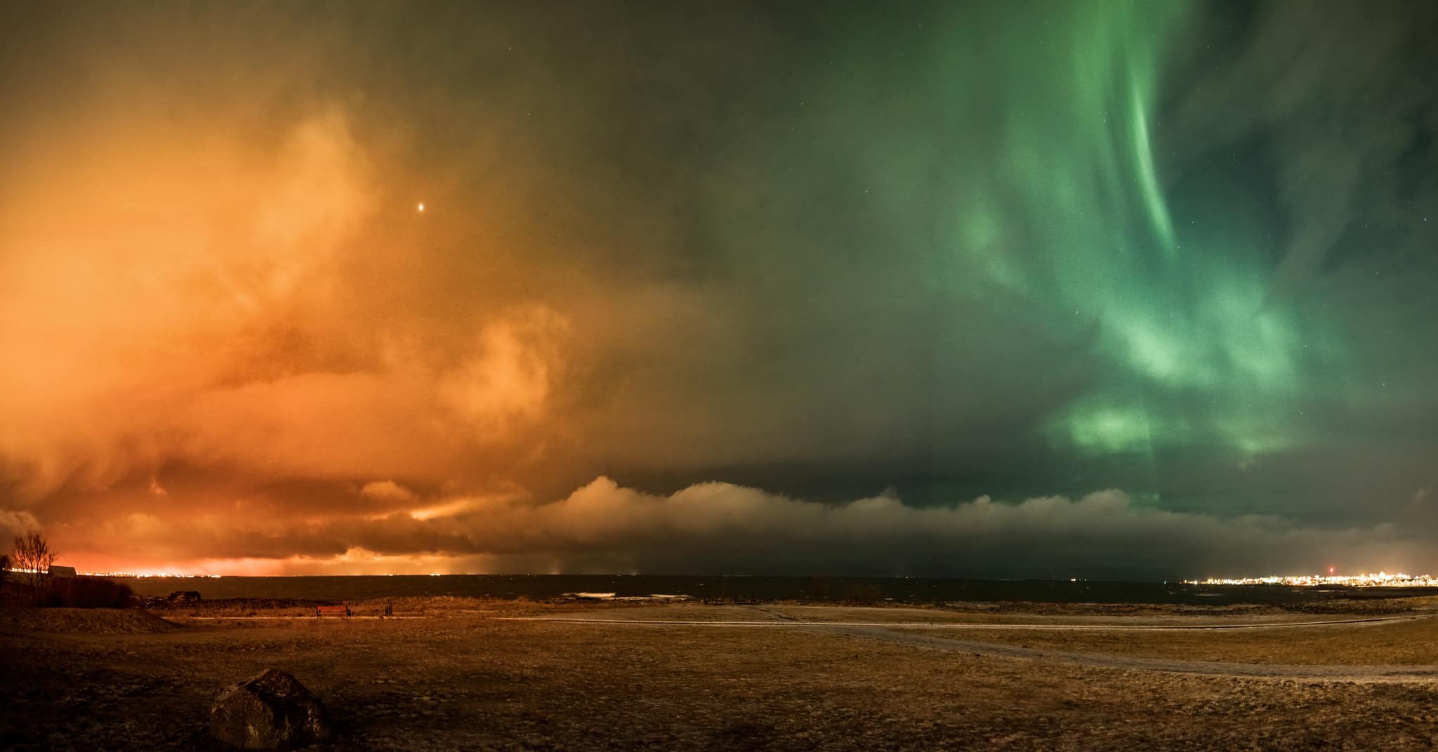 Ciò ha fatto sì che le immagini catturate dai fotografi e dai geologi in zona siano a dir poco sbalorditive. Ci troviamo nella terra dove si incontrano fuoco e ghiaccio... mentre in cielo si incontrano ceneri e aurore boreali... come nel favoloso scatto della baia di Reykjavík, dove il cielo infuocato sfuma nella notte artica.