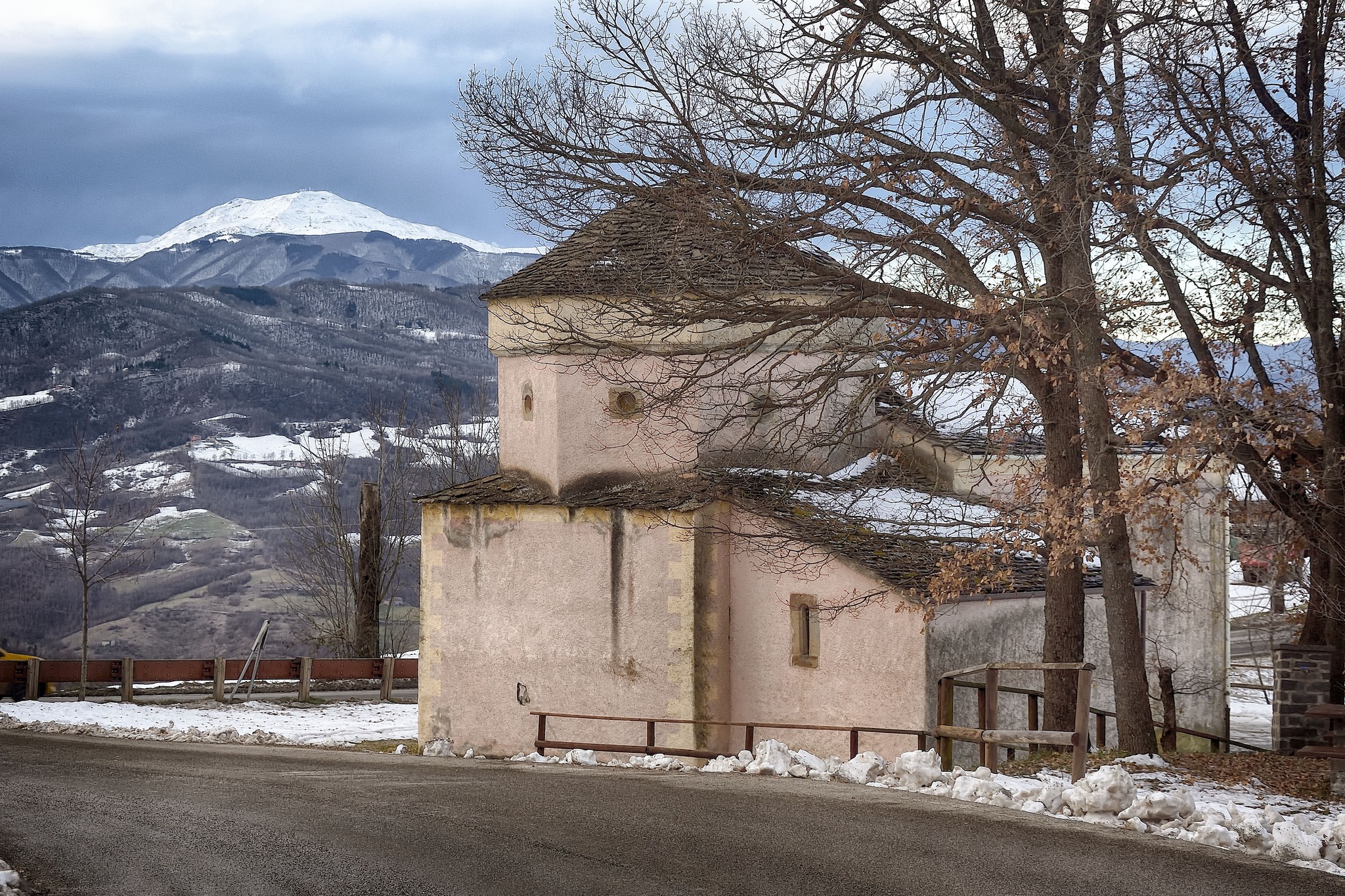 Torniamo a scoprire un po' di patrimonio culturale del nostro territorio, scavalchiamo però il Secchia e saliamo sull'Appennino modenese con Franco Folloni e questo suggestivo scatto dell'oratorio della Madonna del Pratolino vicino a Pavullo nel Frignano con tanto di monte Cimone sullo sfondo.
