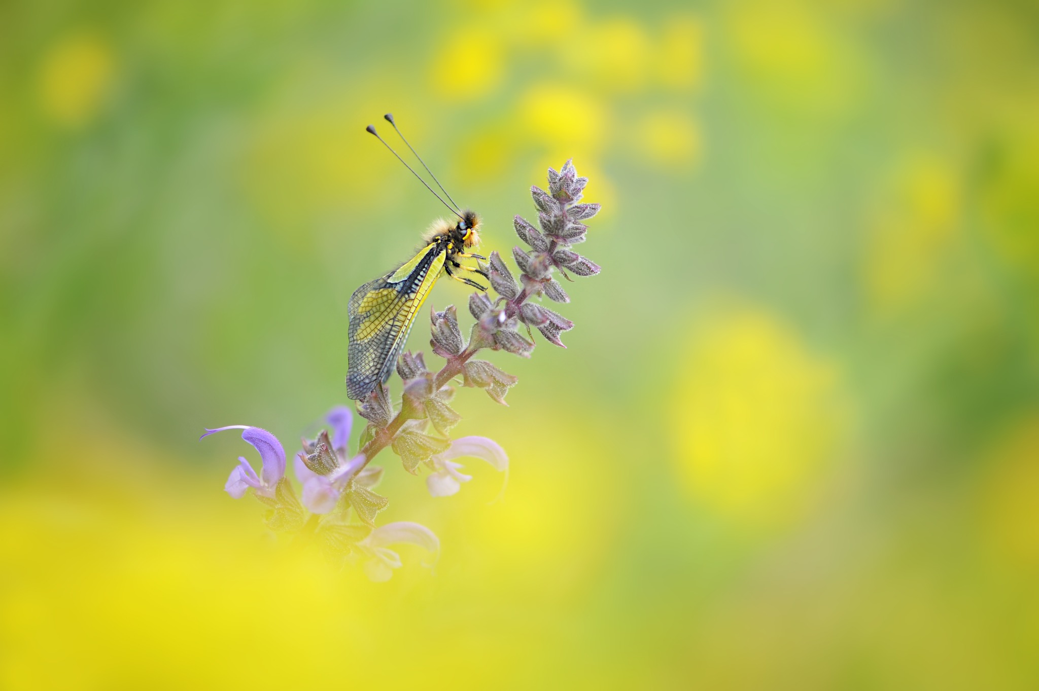 Presenta delle lunghe Antenne a clava molto dritte, che sembrano quelle di una farfalla. Affascinanti, poi, sono le ali trasparenti con reticolature molto fitte, simili a quelle delle libellule. Spettacolare è il suo intenso colore giallo e nero sulle ali, che lo rende facilmente riconoscibile nei prati assolati, specie sui calanchi o in collina. Presenta un corpo peloso, con movenze rapide quando è in volo.