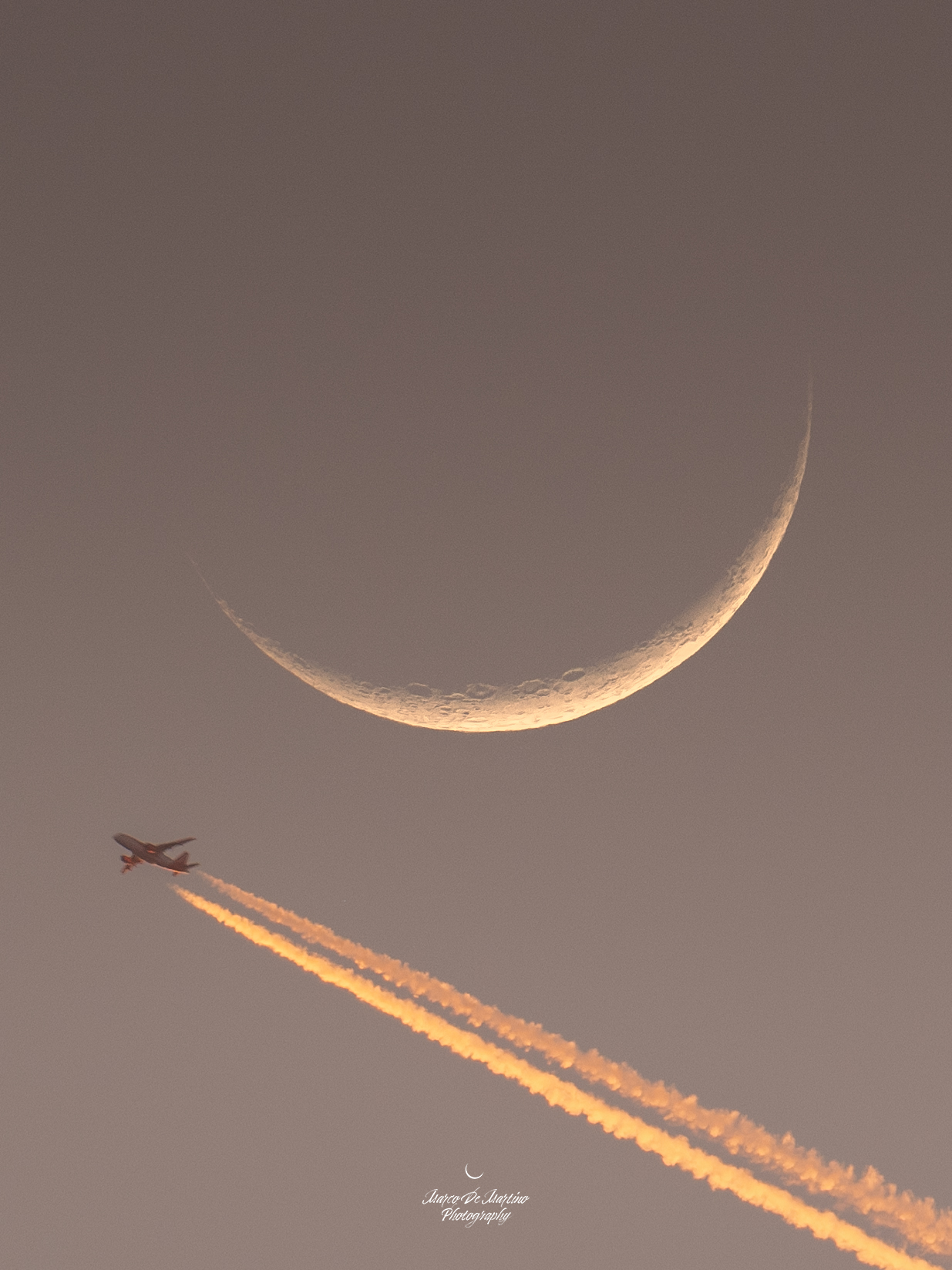 Prospettiva e Distanza: mentre l'aereo vola a circa 10.000 metri di quota, la Luna si trova a circa 384.400 km da noi. Eppure, l'obiettivo del fotografo riesce a schiacciare queste distanze abissali, facendoci sentire parte di un unico, immenso scenario.
