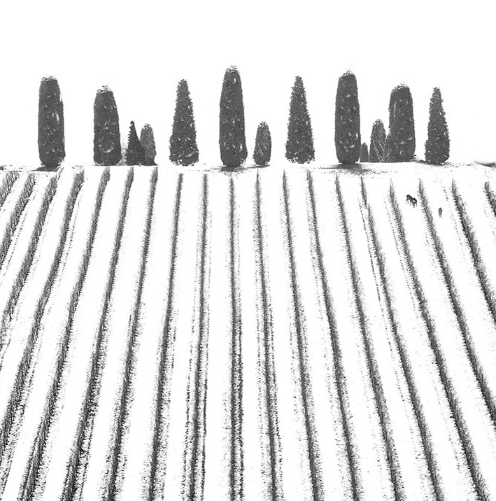 La scelta del contrasto elevato trasforma i solchi della vigna in una texture tattile. Sembra quasi di poter toccare la terra fredda e la corteccia ruvida degli alberi.