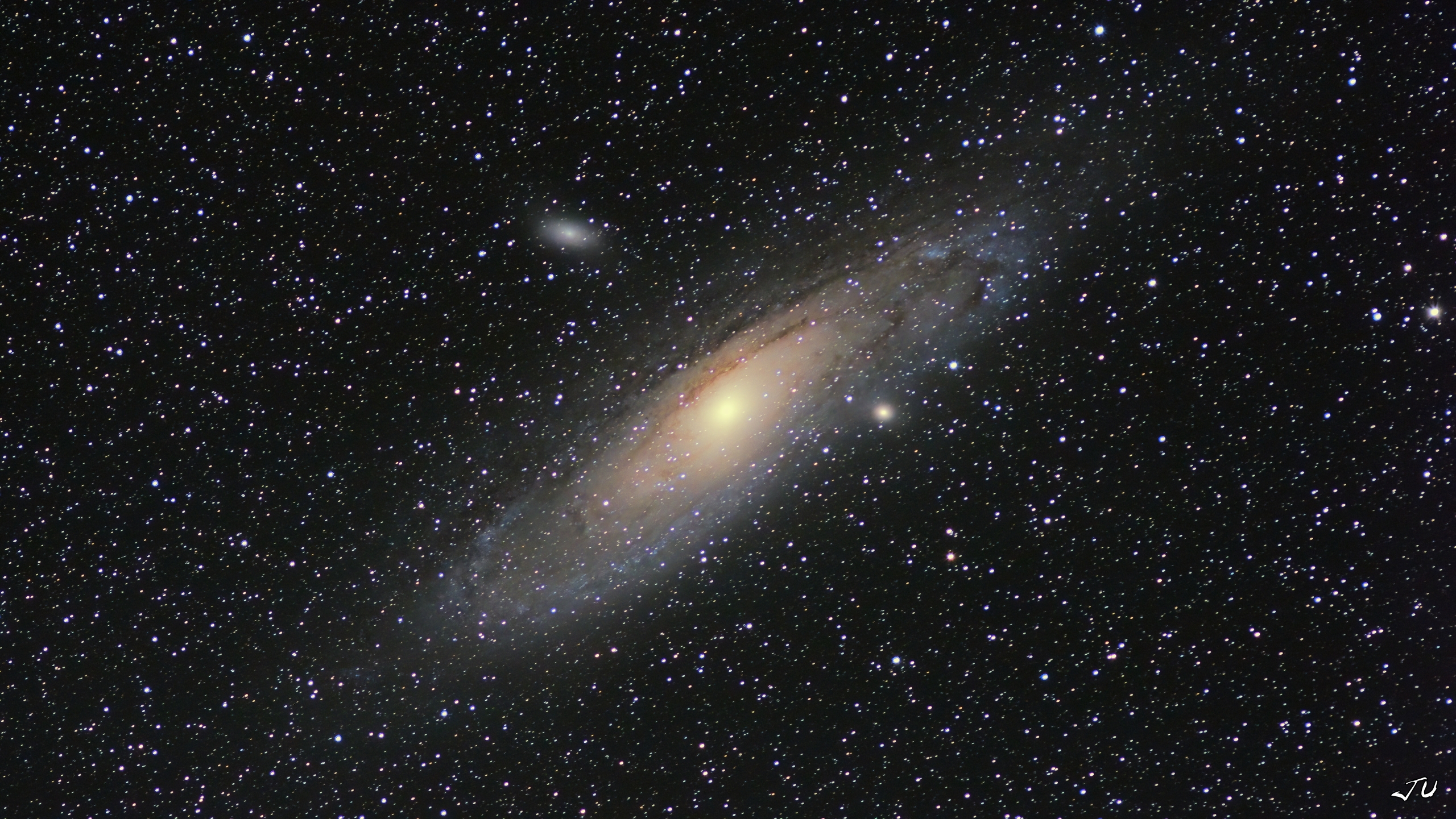 - Galassia di Andromeda: una enorme raccolta di stelle, gas e polveri legate dalla gravità. La possiamo considerare una sorella maggiore della nostra Via Lattea ed è uno dei pochissimi oggetti del cielo profondo che si può osservare ad occhio nudo (con il cielo giusto). La Galassia di Andromeda è in avvicinamento alla Via Lattea alla velocità di circa 400.000 km/h, pertanto, in un tempo stimato sui 2,5 miliardi di anni avremo uno "scontro tra Galassie". Nulla di preoccupante, la densità di stelle nelle due galassie è tale che l'ipotesi di una collisione catastrofica tra corpi celesti sia remota.
