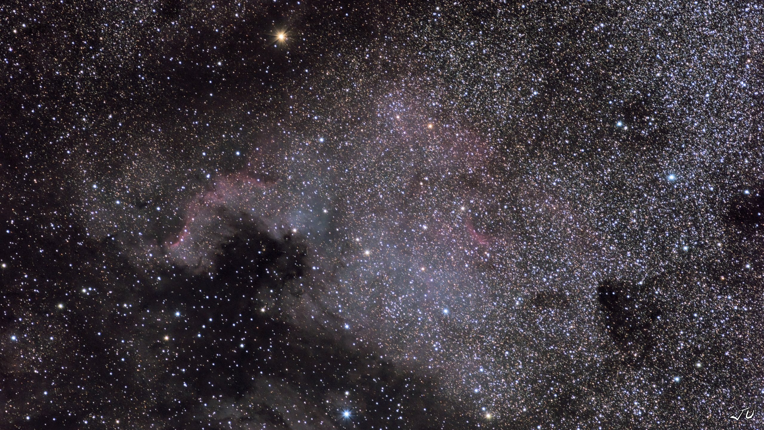 - Nebulosa Nord America (NGC 7000): è una regione di gas e polveri nello spazio interstellare che brilla grazie alla radiazione delle stelle circostanti o essere oscure a causa dell'assorbimento della luce. E una nuvola diffusa dove stanno nascendo moltissime stelle, dista da noi circa 1960 anni luce e prende il nome dalla sua forma che ricorda quella del Golfo del Messico, Stati Uniti e Canada.