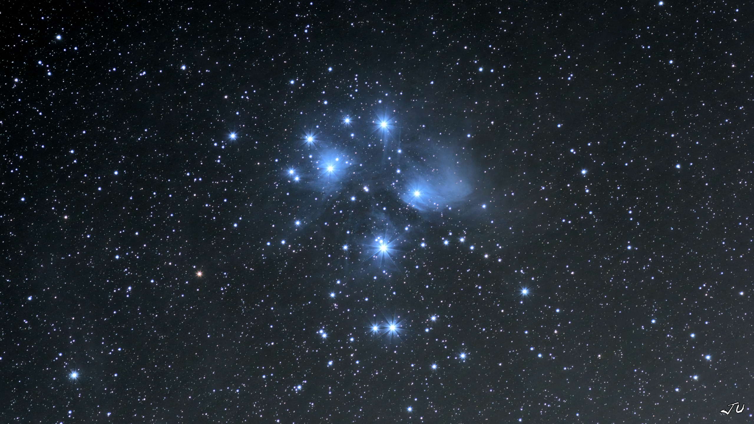 - Ammasso stellare delle Pleiadi: trattasi di un gruppo di stelle che si sono formate insieme e sono legate gravitazionalmente. Sono stelle giovani e lo si deduce dalla nebulosità che ancora le avvolge, come per la stella Merope sulla destra.