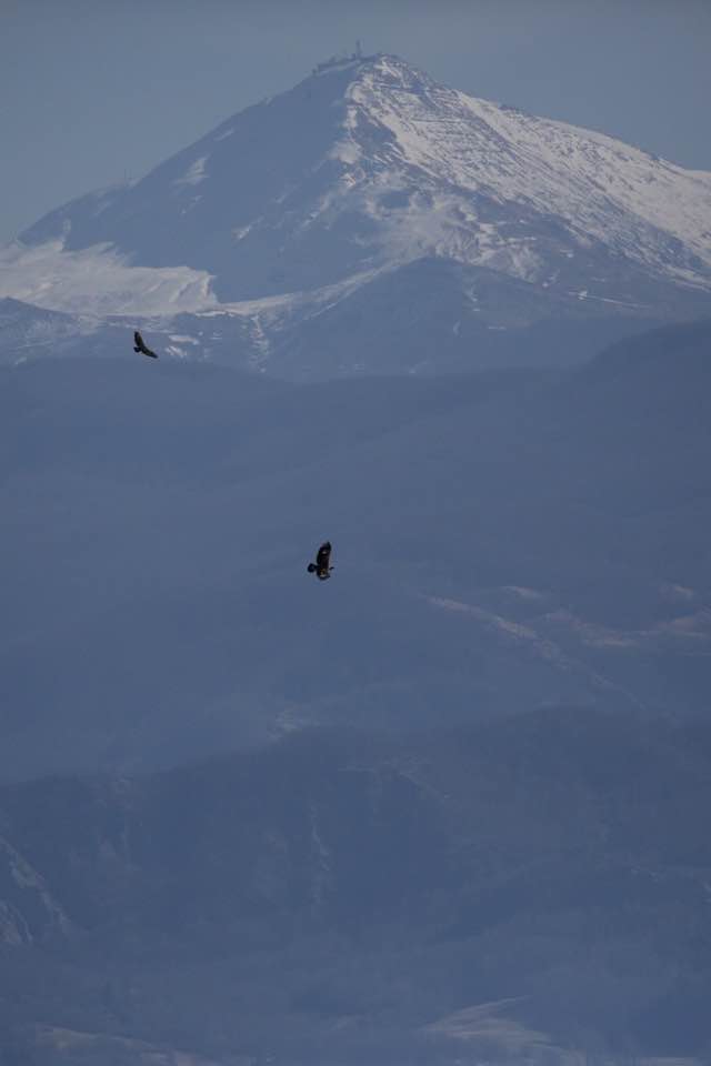 Uno scontro tra giganti nel cuore del Gigante, tra i rapaci diurni più grandi della nostra Provincia. Siamo parlando di un esemplare di Aquila reale (Aquila chrysaetos) che si confronta con un esemplare di Poiana (Buteo buteo).