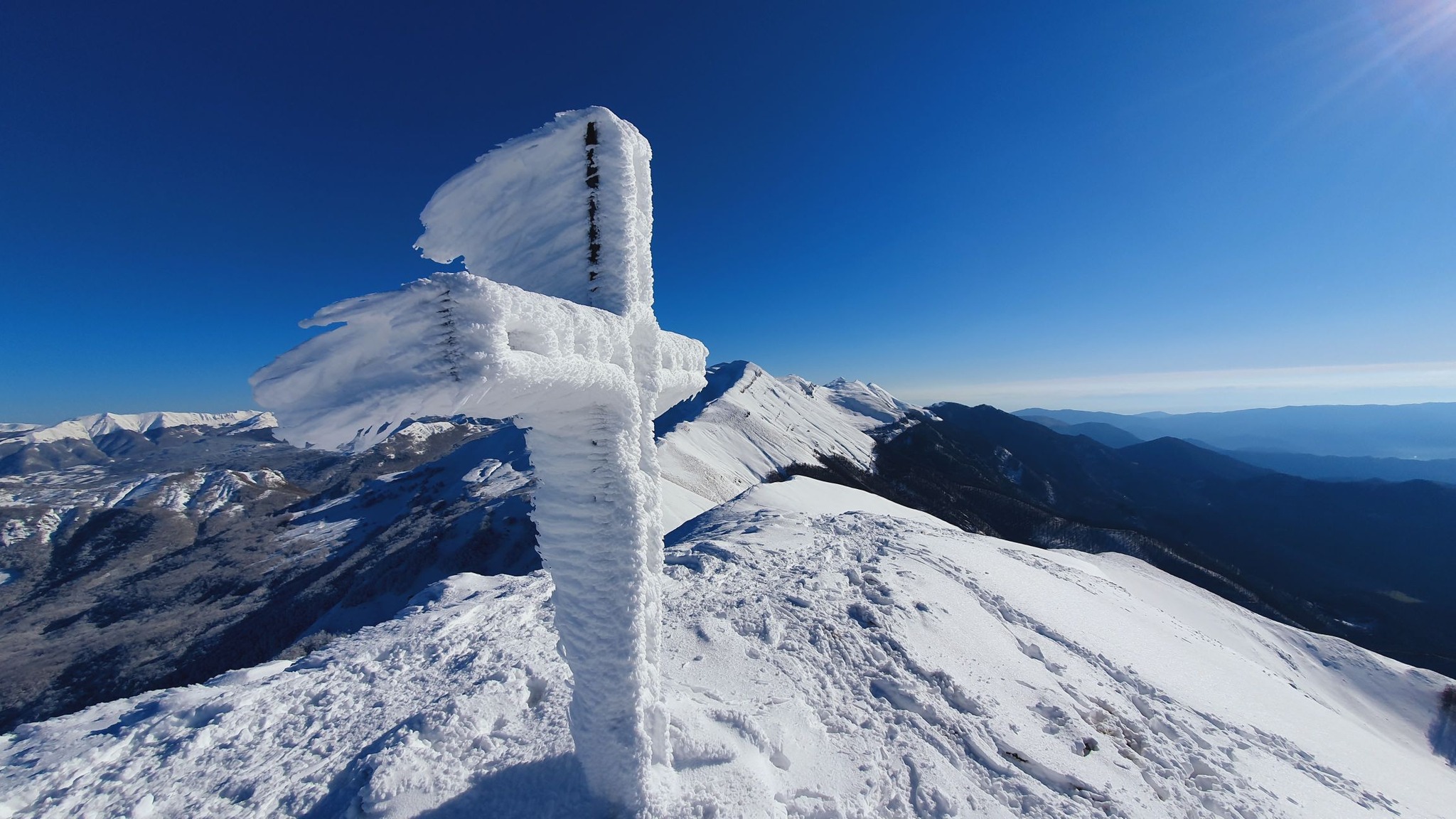 La croce immortalata è un elemento iconico di molte vette appenniniche. In inverno, il vento e il freddo intenso creano depositi di ghiaccio galaverna o rime, un fenomeno causato dall'impatto delle minuscole goccioline di nebbia sovraraffreddate che si congelano immediatamente al contatto con le superfici. Questo dà alla croce il caratteristico aspetto "imbiancato" e scultoreo.