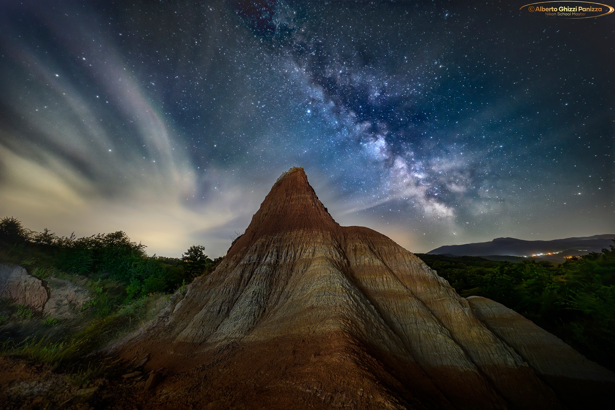 Torniamo a fari visita alle meravigliose formazioni calanchive di Atticola, sulla riva destra dell'Enza in territorio di Vetto e lo facciamo con questo spettacolare scatto di Alberto Ghizzi Panizza che non solo cattura lo spettacolo della volta celeste, ma anche quello del suolo geologico.
