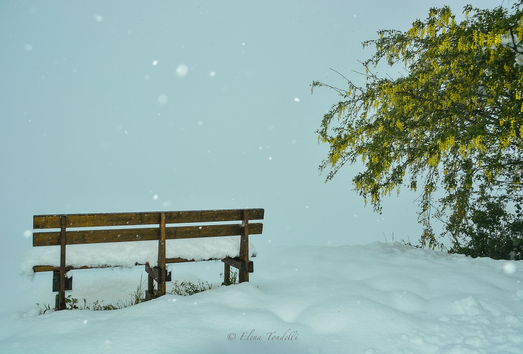 Qui vediamo la contrapposizione tra il candore bianco della neve ed il giallo intenso di un Laburnum anagyroides.