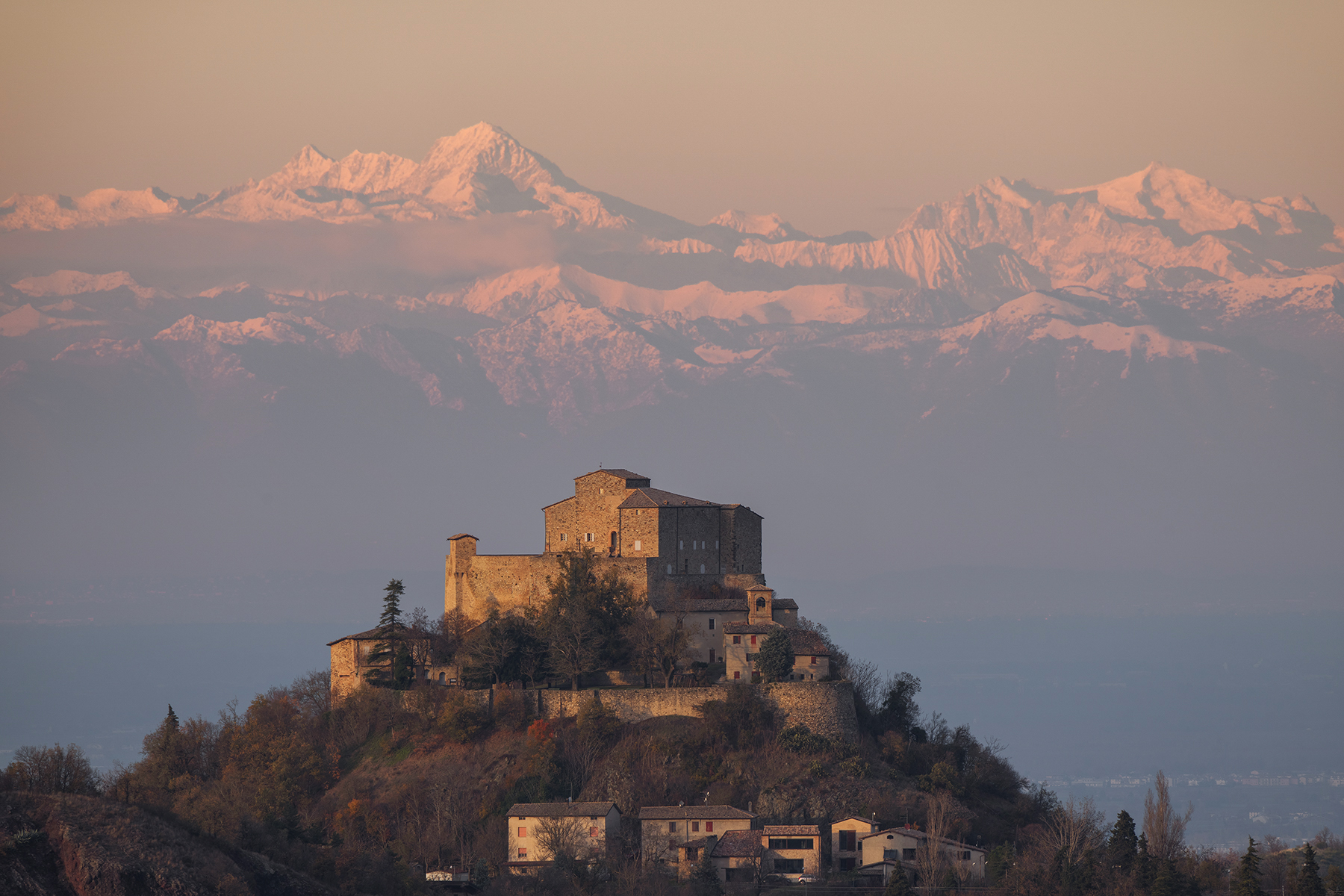 Ancora una magia di Andrea Frassinetti che con questo spettacolare scatto del Castello di Rossena, incornicia la luce del tramonto, regalandoci in lontananza la maestosità delle Alpi Retiche Meridionali, e in particolare due vette imponenti del Gruppo Adamello-Presanella: il Carè Alto e la Cima Presanella.