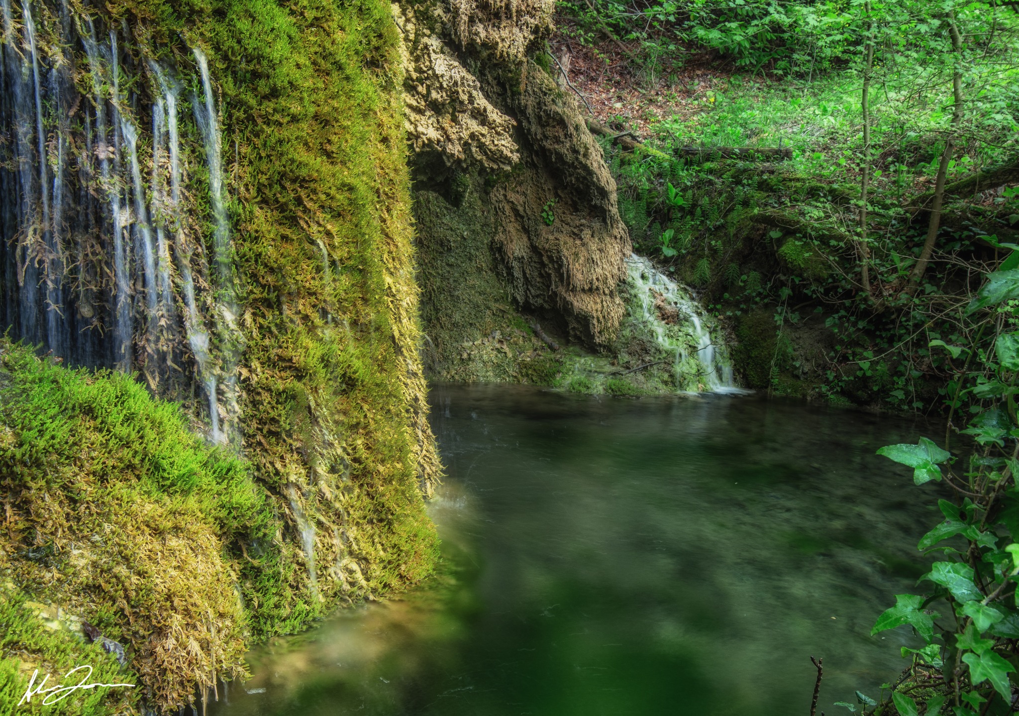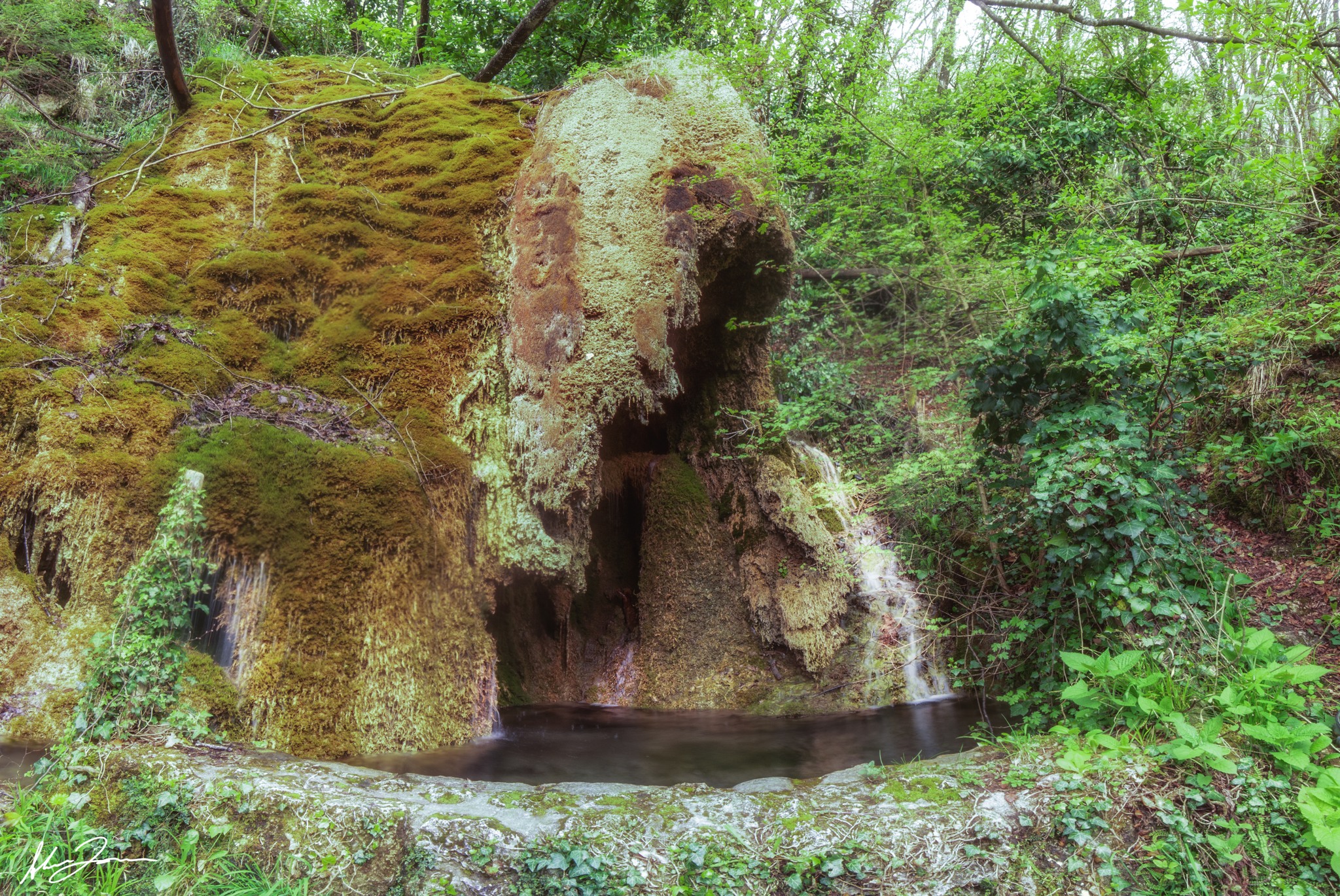 Nato dalla confluenza di piccole sorgenti carsiche, questo specchio d’acqua è alimentato da polle cristalline che emergono direttamente dalla roccia. Qui, il paesaggio è dominato da formazioni di travertino naturale — una roccia calcarea leggera e porosa — che si forma attraverso secoli di lenta deposizione minerale. L’acqua, ricca di carbonato di calcio, precipita a contatto con l’aria, creando vere e proprie "cascatelle di pietra" su cui si adagiano muschi, felci e altre piante tipiche degli ambienti umidi.