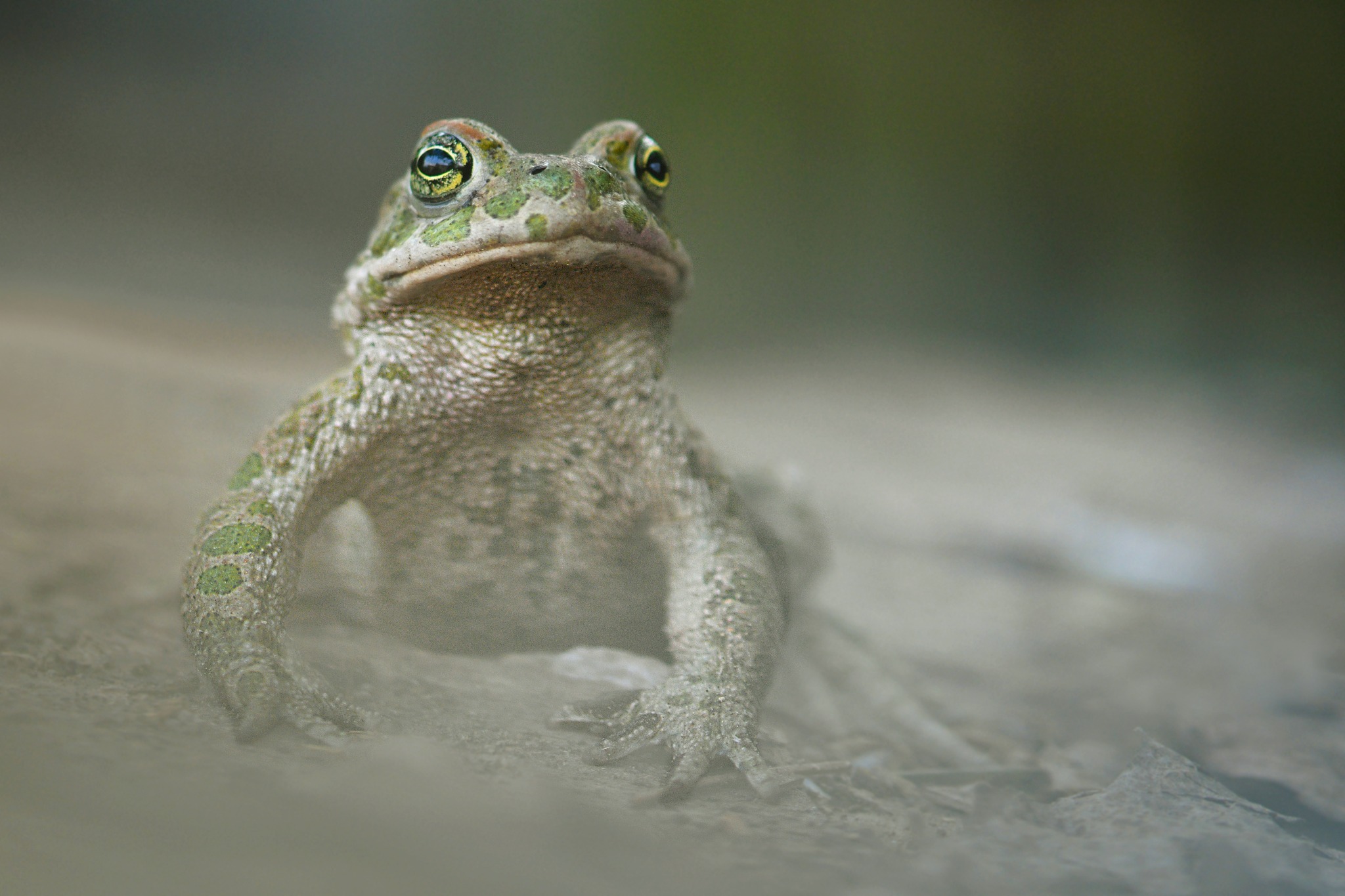Nello scatto di Beri, lo sguardo del rospo appare quasi ieratico. Gli occhi sono la sua caratteristica più magnetica: grandi, sporgenti e dotati di un'iride metallica che vira dal verde dorato al giallo, attraversata da una pupilla orizzontale. Questa conformazione gli conferisce una vista eccellente, fondamentale per le sue abitudini prevalentemente crepuscolari e notturne.