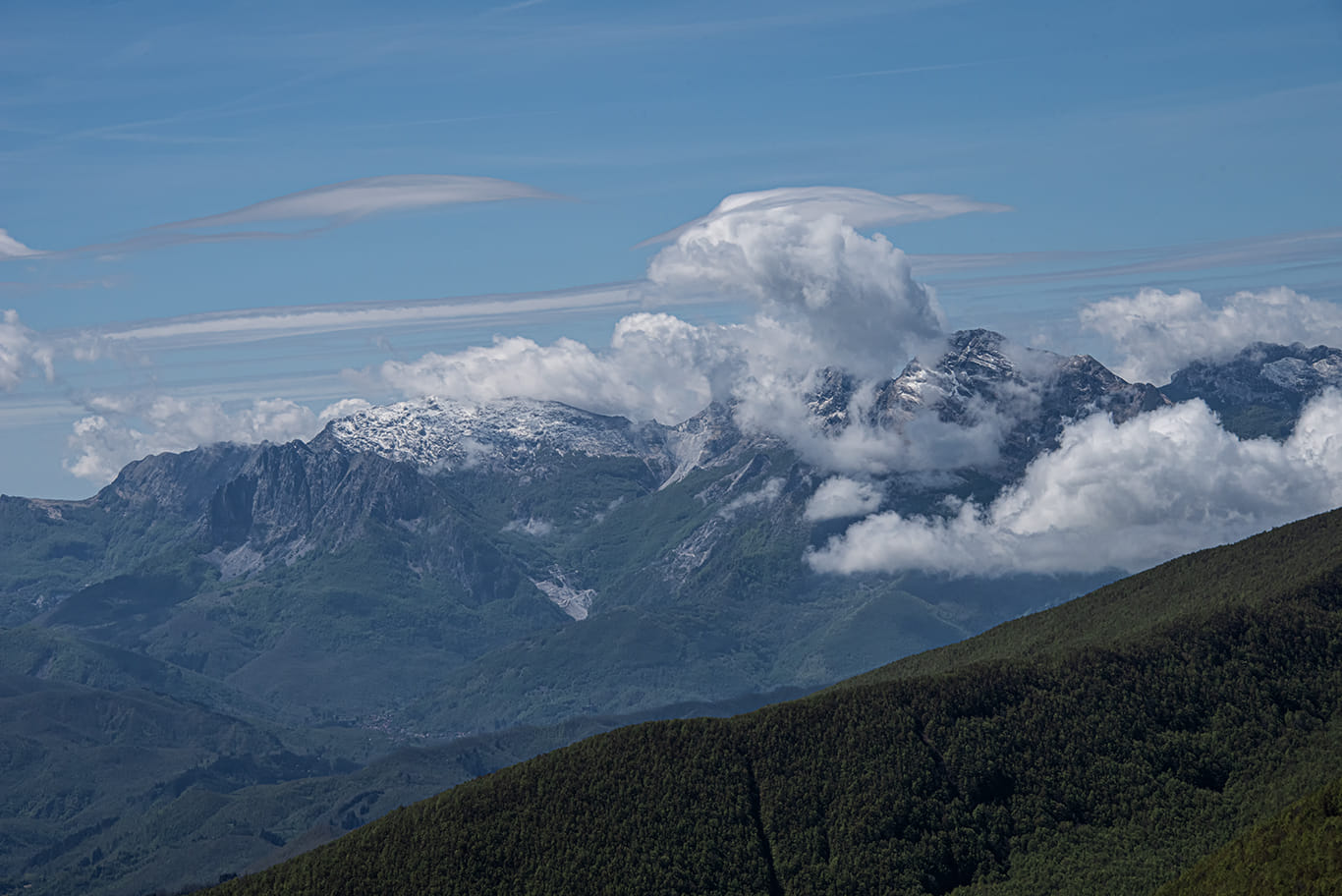 Dalle nostre creste si può godere di un'ottima visuale verso di loro, situate nella Toscana nord-occidentale, tra le province di Massa-Carrara e Lucca. Sebbene geograficamente vicine agli Appennini, le Alpi Apuane presentano caratteristiche geologiche e paesaggistiche distinte, con vette che superano spesso i 1.800 metri, tra cui il Monte Pisanino (1.946 m), il punto più alto.