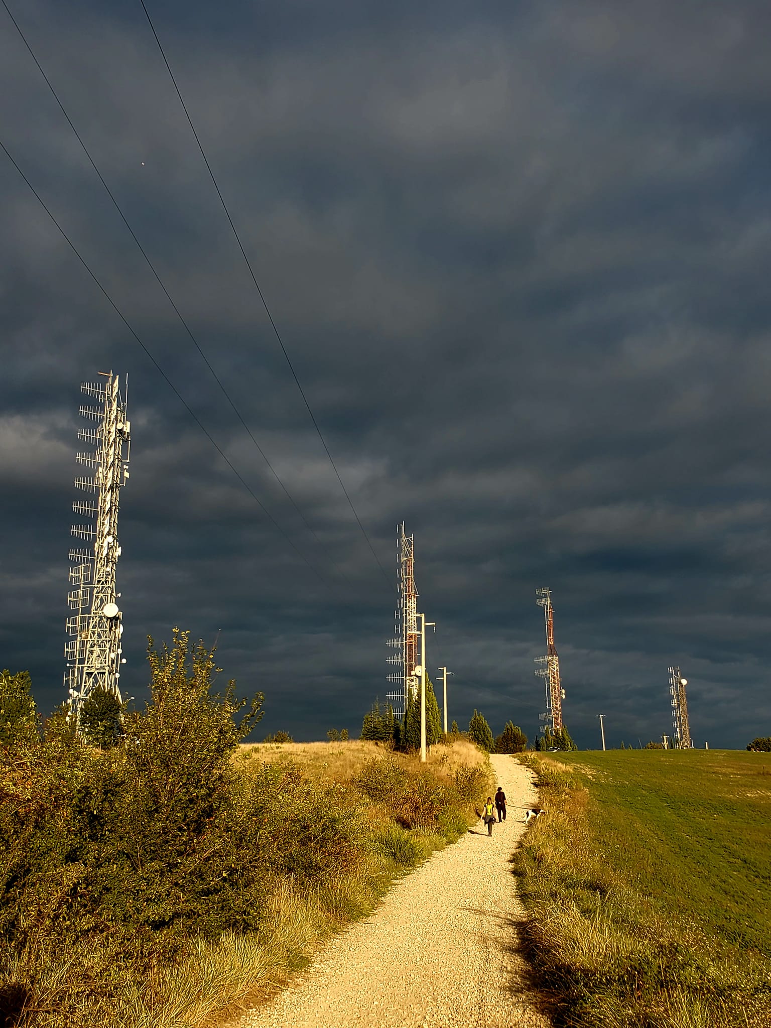 Guardando questo scatto abbiamo un bel Sole luminoso a ovest e un muro di nuvole a est, il muro di nuvole può apparire più scuro o addirittura nero per alcuni motivi legati all'illuminazione, al contrasto e alla diffusione della luce.