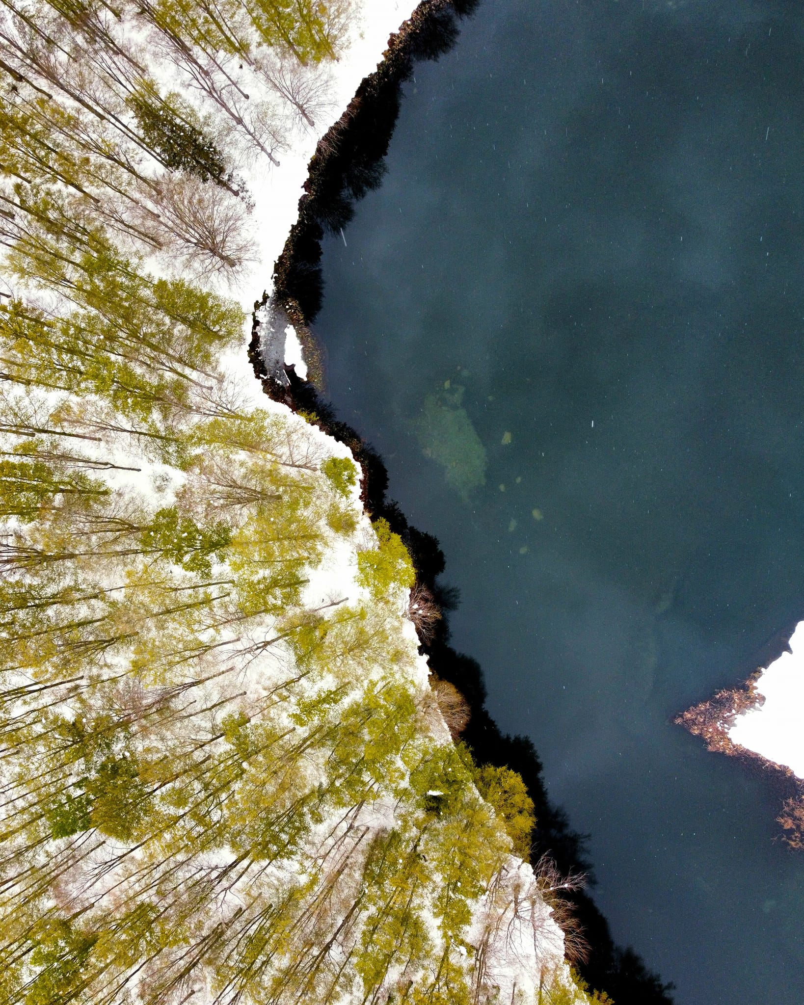 Torniamo sul nostro Appennino recentemente ricoperto di neve. Con questo scatto aereo di Maurizio D'Addona vediamo uno spicchio di bosco innevato che contrasta con il lago Pranda vicino a Cerreto Laghi.