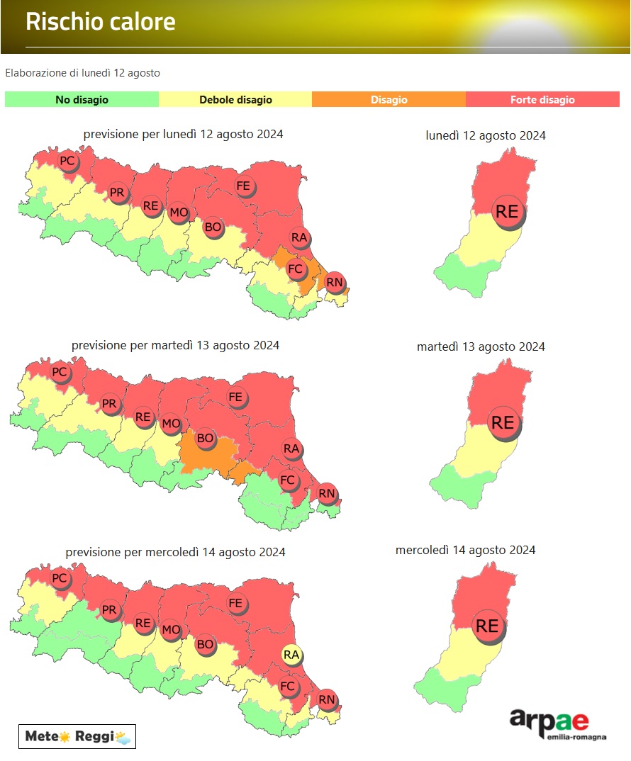 L'hot-spot di questo fenomeno è sicuramente il centro urbano di Reggio Emilia ed in generale anche gli altri grandi centri urbani della Pianura e Pedecollinare. Un forte disagio che dura ormai da decine di giorni ininterrottamente. Va un po' meglio in Appennino, ma il gran caldo si avverte bene anche sulla Collina dove il disagio è percettibile molto bene durante le ore centrali della giornata. Di notte va un po' meglio, ma le temperature tropicali (minime maggiori di 20°C), salgono fino ai piedi delle montagne.