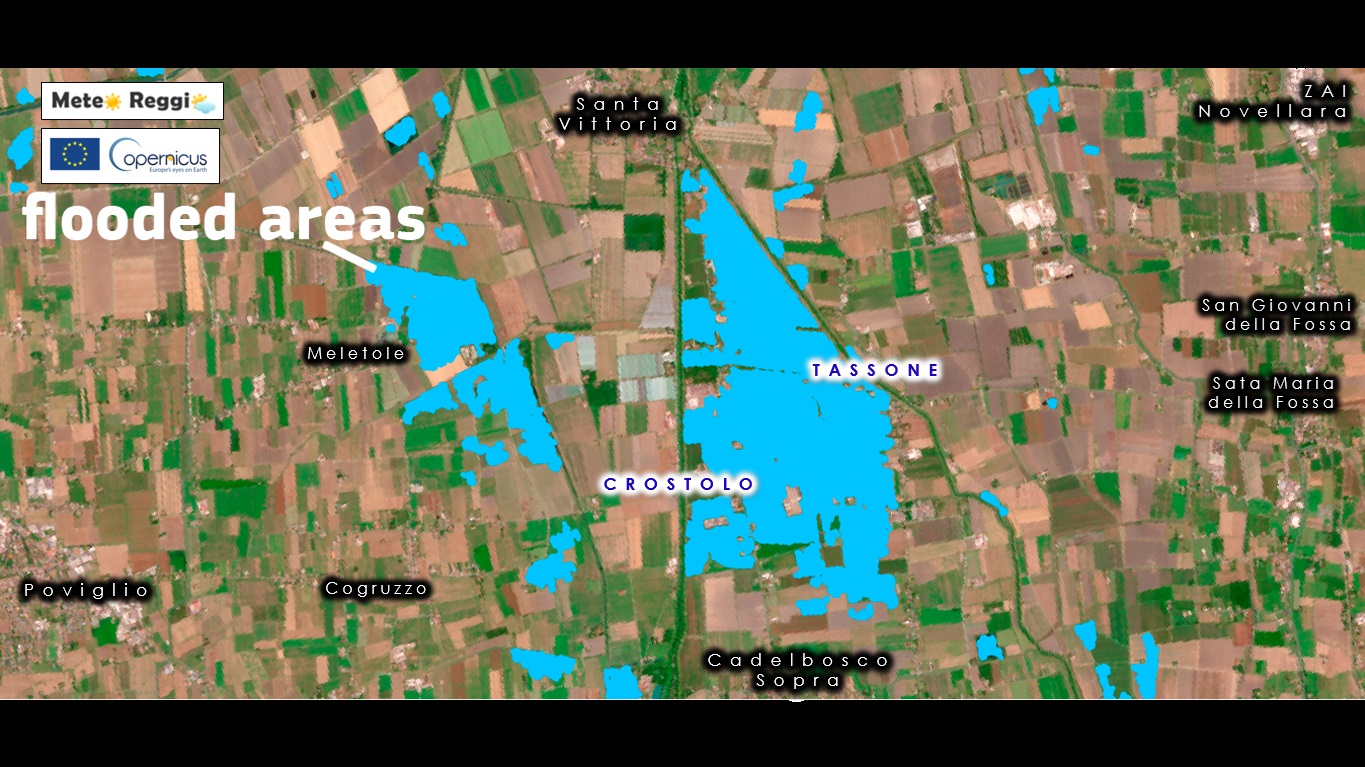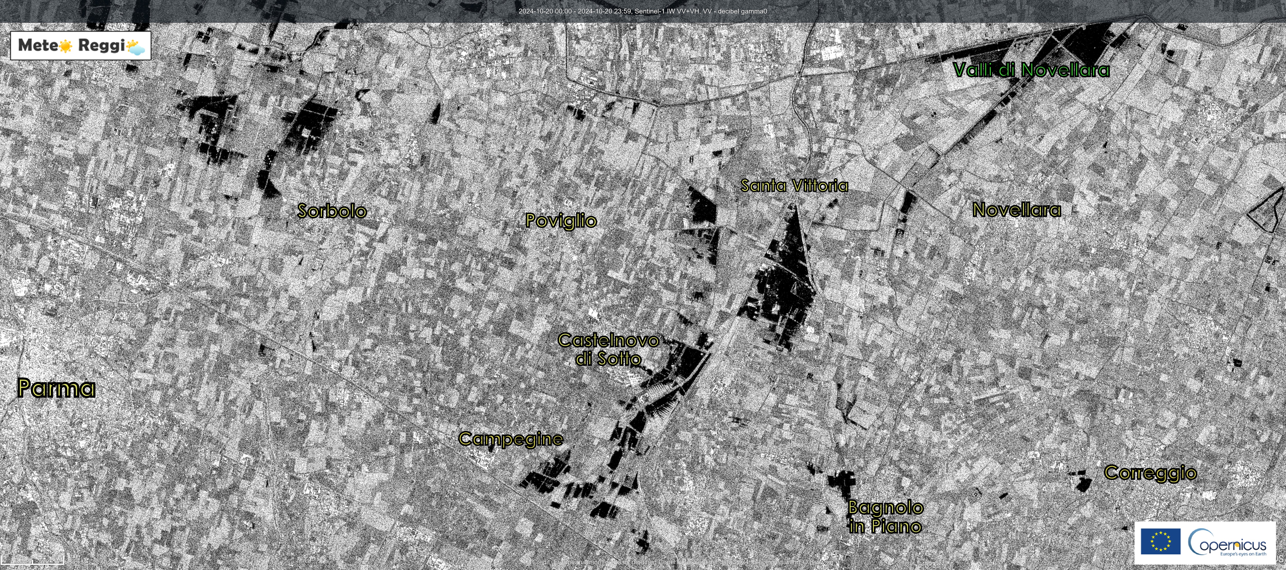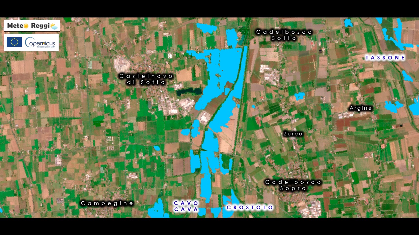 Scomodiamo ancora il sistema satellitare Copernicus EU per vedere più in dettaglio ciò che è accaduto domenica 20 ottobre nella nostra Pianura. Immagini scattate qualche ora dopo il cedimento degli argini di Crostolo, Canalazzo Tassone e Cavo Cava.