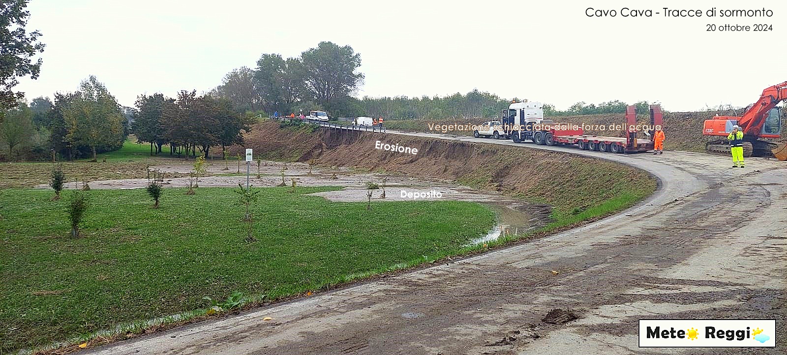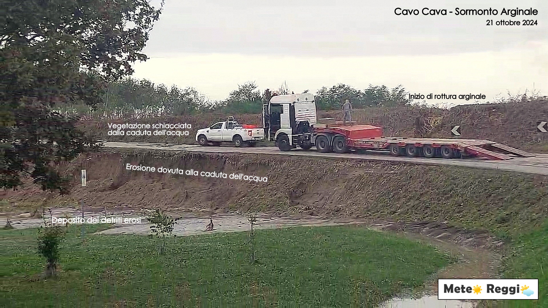 - Se l'erosione prosegue senza interventi, la sezione dell'argine erosa diventa sempre più debole, fino a cedere del tutto. Questo può provocare il collasso parziale o totale dell’argine in quel punto, permettendo all'acqua di fluire liberamente attraverso la breccia.