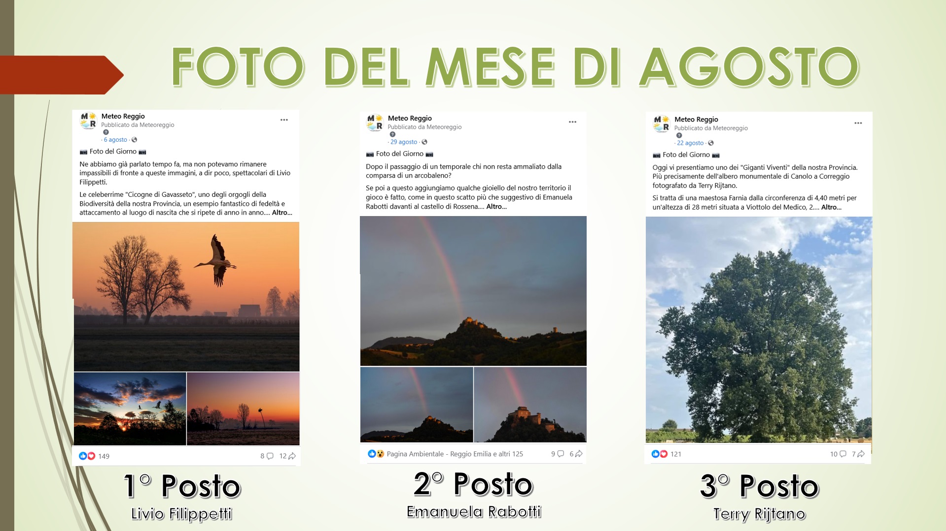 Un mese caldo che premia i paesaggi di Pianura rispetto all'Appennino e soprattutto premia la biodiversità! Sul podio, però, troviamo anche un po' di storia e di Collina. Ma andiamo per gradi... o per gradini.