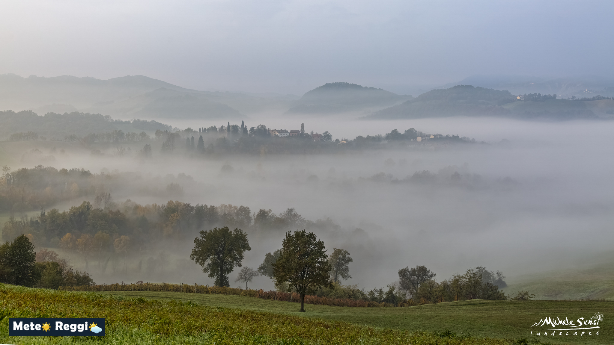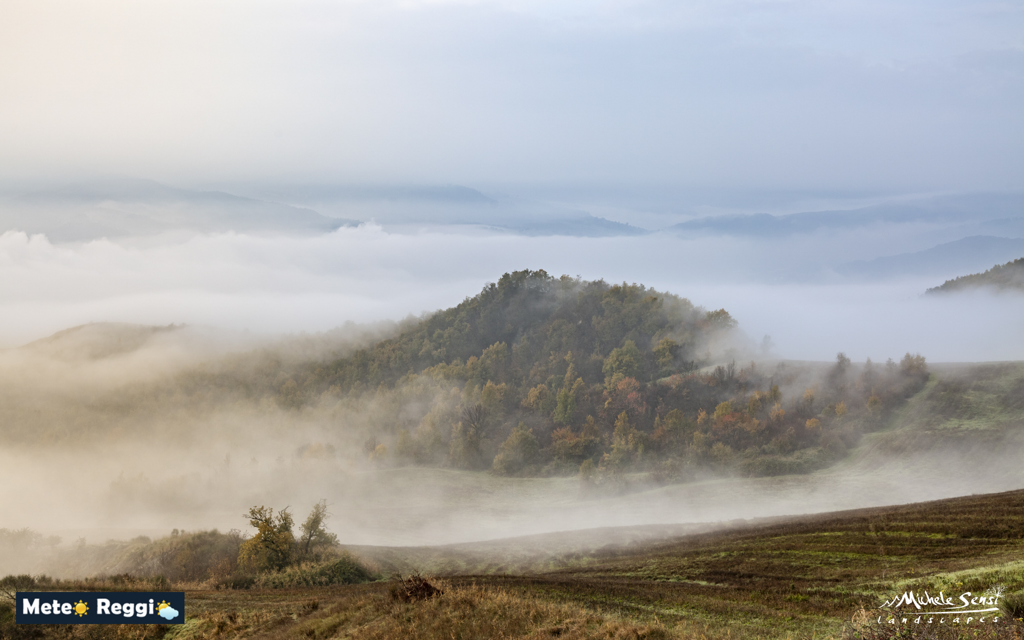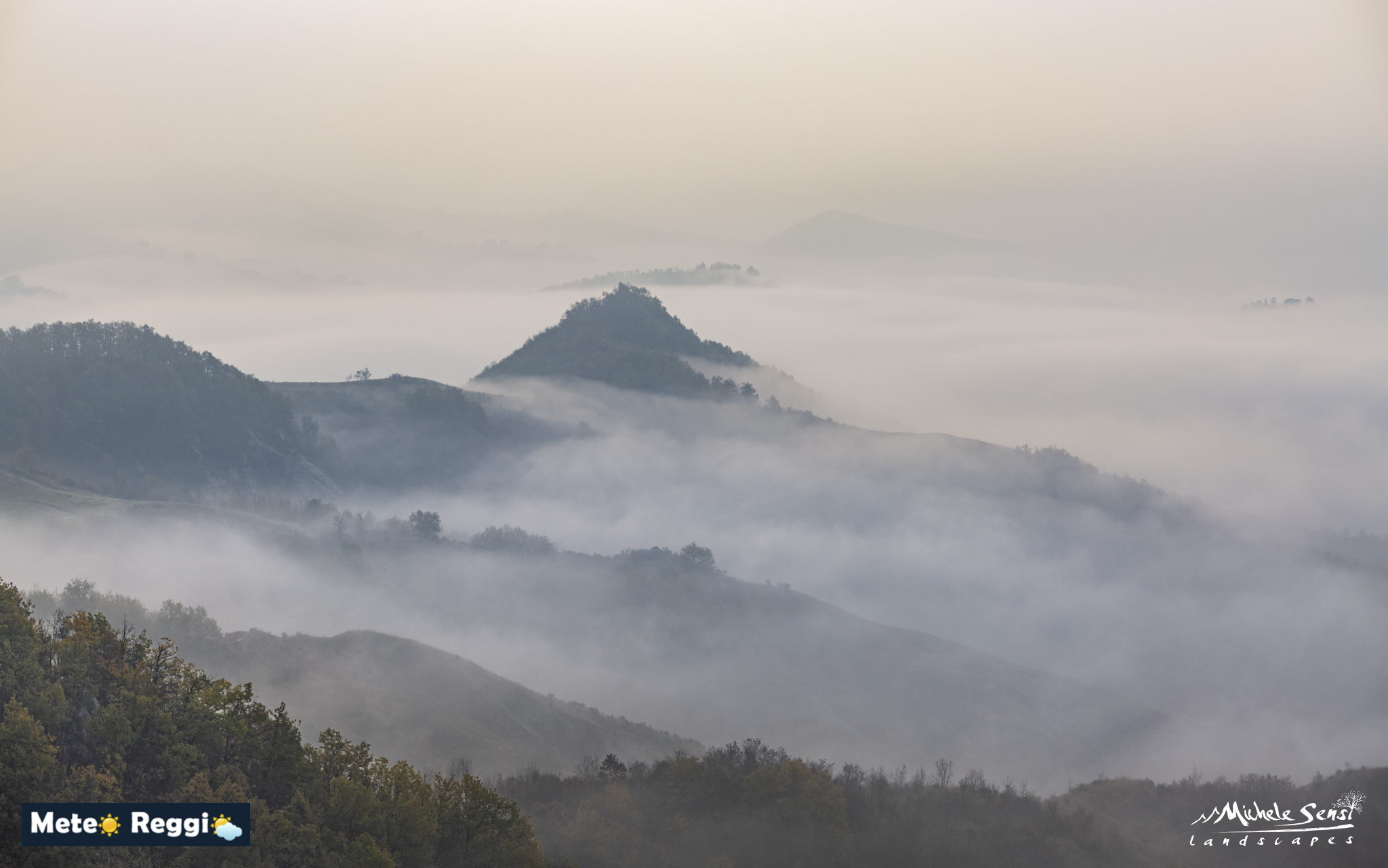 In questo trittico di immagini catturate da Michele la nebbia è protagonista, avvolgendo il paesaggio e creando un effetto di stratificazione. Questo fenomeno caratterizza spesso le prime ore del giorno in autunno o inizio inverno, trasformando colline e vallate in una scena quasi onirica.