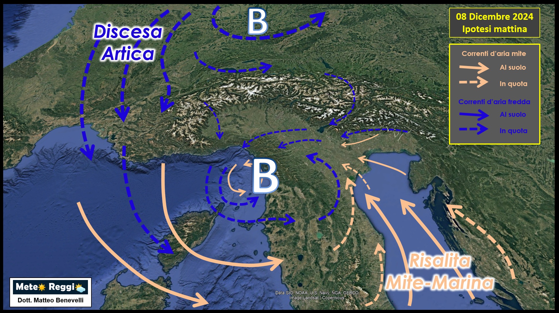 La prima cosa da dire è che siamo al cospetto di una discesa d'aria fredda di matrice "Artico-marittima", quindi, dall'alto atlantico e che scenderà dal mare del Nord sulla Francia per gettarsi poi nel Mediterraneo. Entrando nel mare si creerà un vortice di bassa pressione (principio di Venturi) che ruoterà in senso antiorario, facendo compiere una curva all'aria fredda.