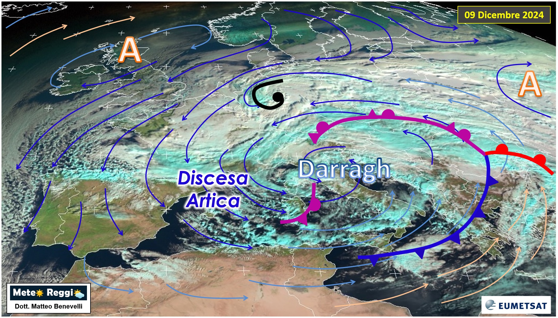 con il suo avanzare verso sud-est, Darragh si intensifica grazie all'interazione con il "jet stream", un flusso di venti molto rapidi in alta quota che funge da "guida" per i cicloni extratropicali. Entrando nel Mediterraneo, il ciclone risucchia ulteriore energia dalle acque ancora relativamente calde, intensificando le precipitazioni.