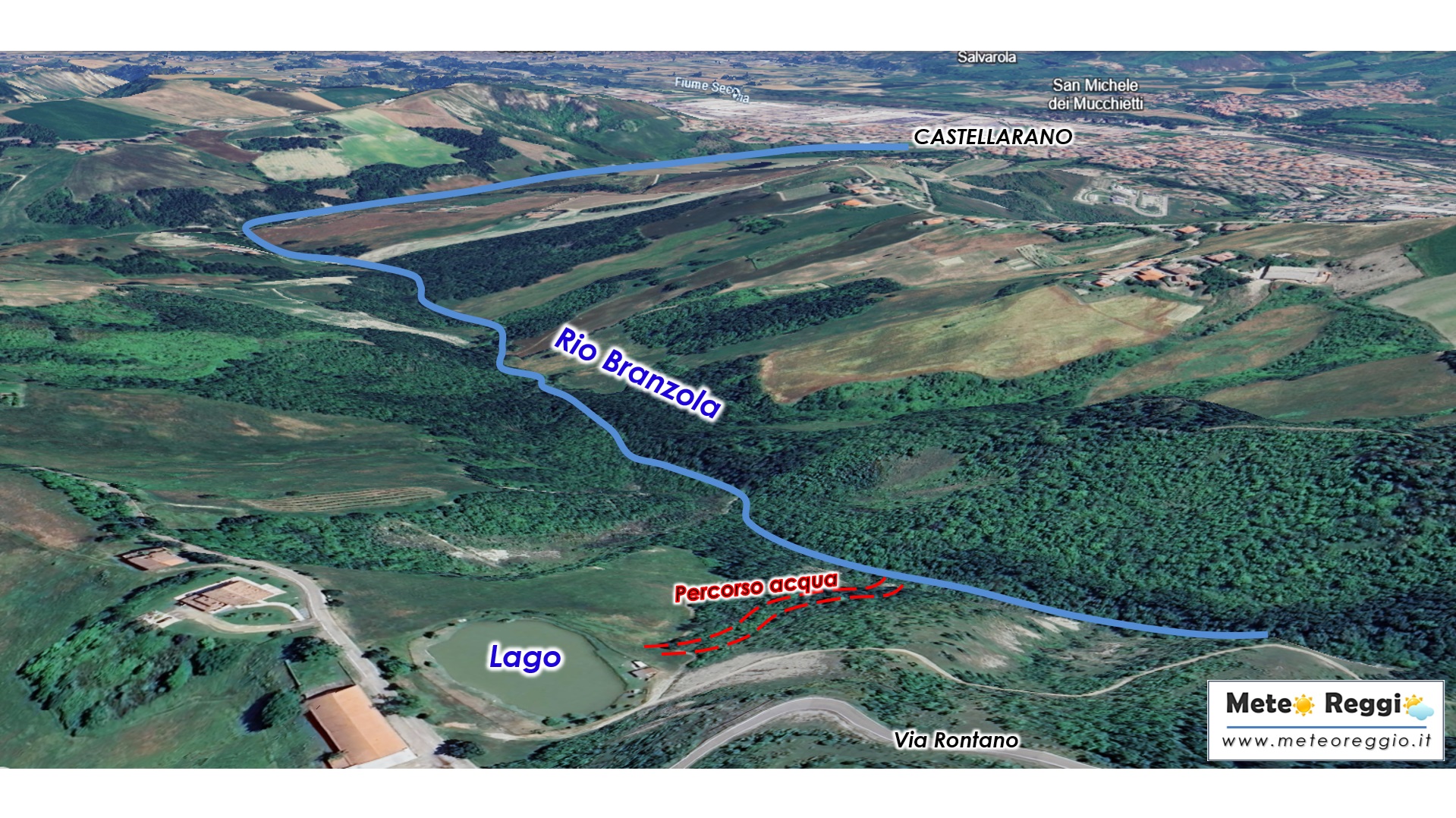 L'acqua è confluita dentro il modesto rio Branzola che più a valle arriva nel cuore dell'abitato di Castellarano, in prossimità dello Stadio prosegue tombato in via Mulino e via San Michele di fronte alla bellissima Rocchetta per poi sfociare nel fiume Secchia 550 metri più avanti.