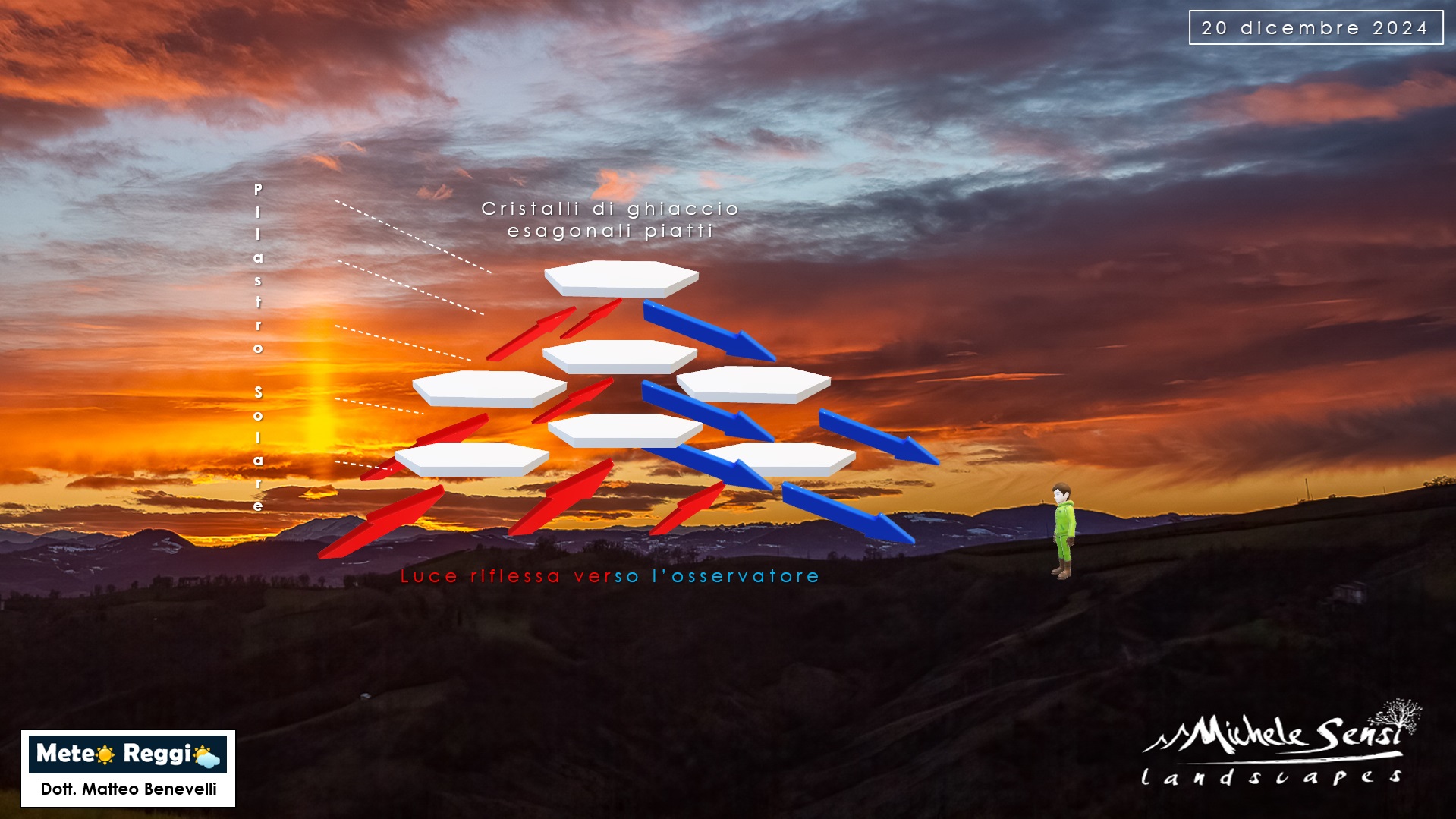 - Cristalli a forma di piastra: I cristalli di ghiaccio piatti e orizzontali agiscono come specchi, riflettendo la luce del Sole e creando l’effetto di una colonna luminosa.