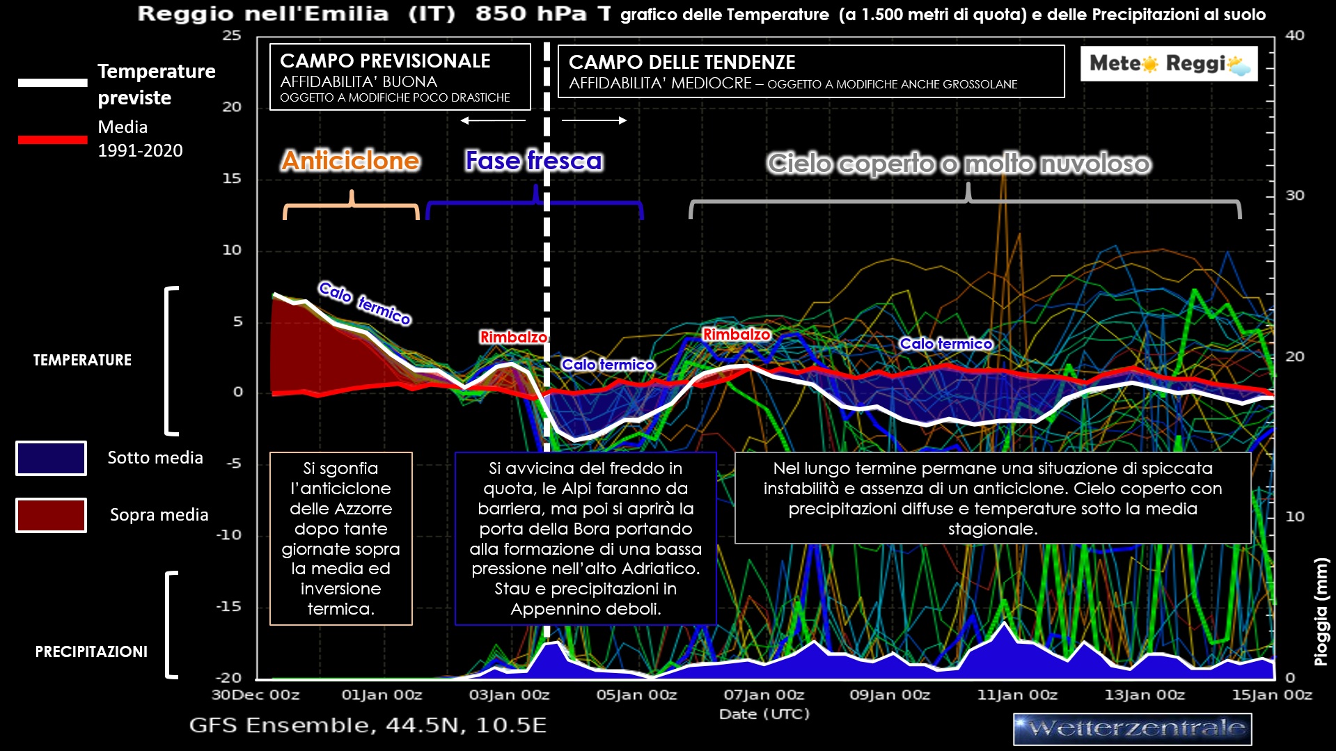 Si avvicina una delle sere più attese di questo periodo. Meteorologicamente parlando questa fine di 2024 ha visto l'anticiclone delle Azzorre come vero protagonista riportando l'inversione termica su tutto il reggiano, ma senza lo spauracchio della nebbia in Pianura. Tuttavia qualcosa nell'aria sta cambiando e anche il poderoso anticiclone sembra destinato a sgretolarsi ...