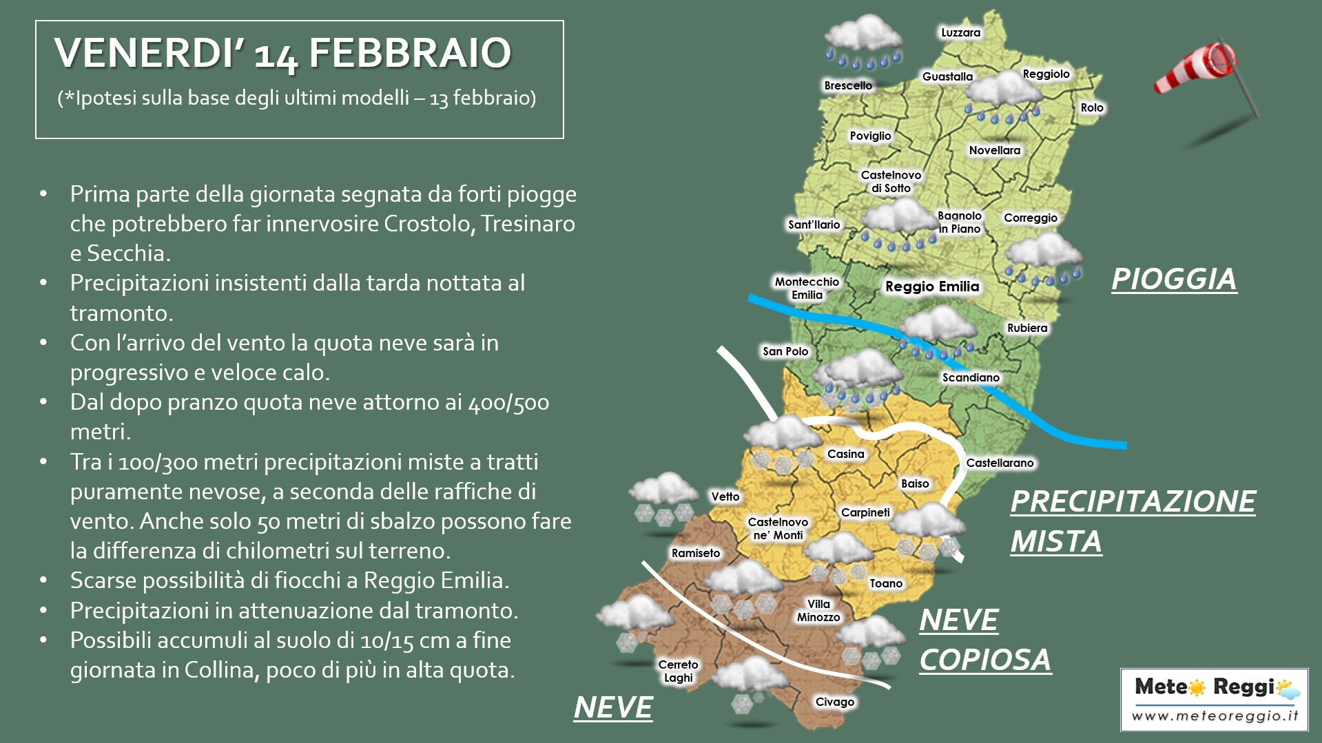 La giornata di San Valentino, quindi, sarà caratterizzata da condizioni meteorologiche perturbate, con piogge intense in pianura e nevicate in collina. L'innesco di venti di Bora modificherà progressivamente la quota neve, ma difficilmente la neve raggiungerà Reggio Emilia. Attenzione ai rischi idrogeologici per saturazione del suolo e al calo termico in arrivo dopo la perturbazione.