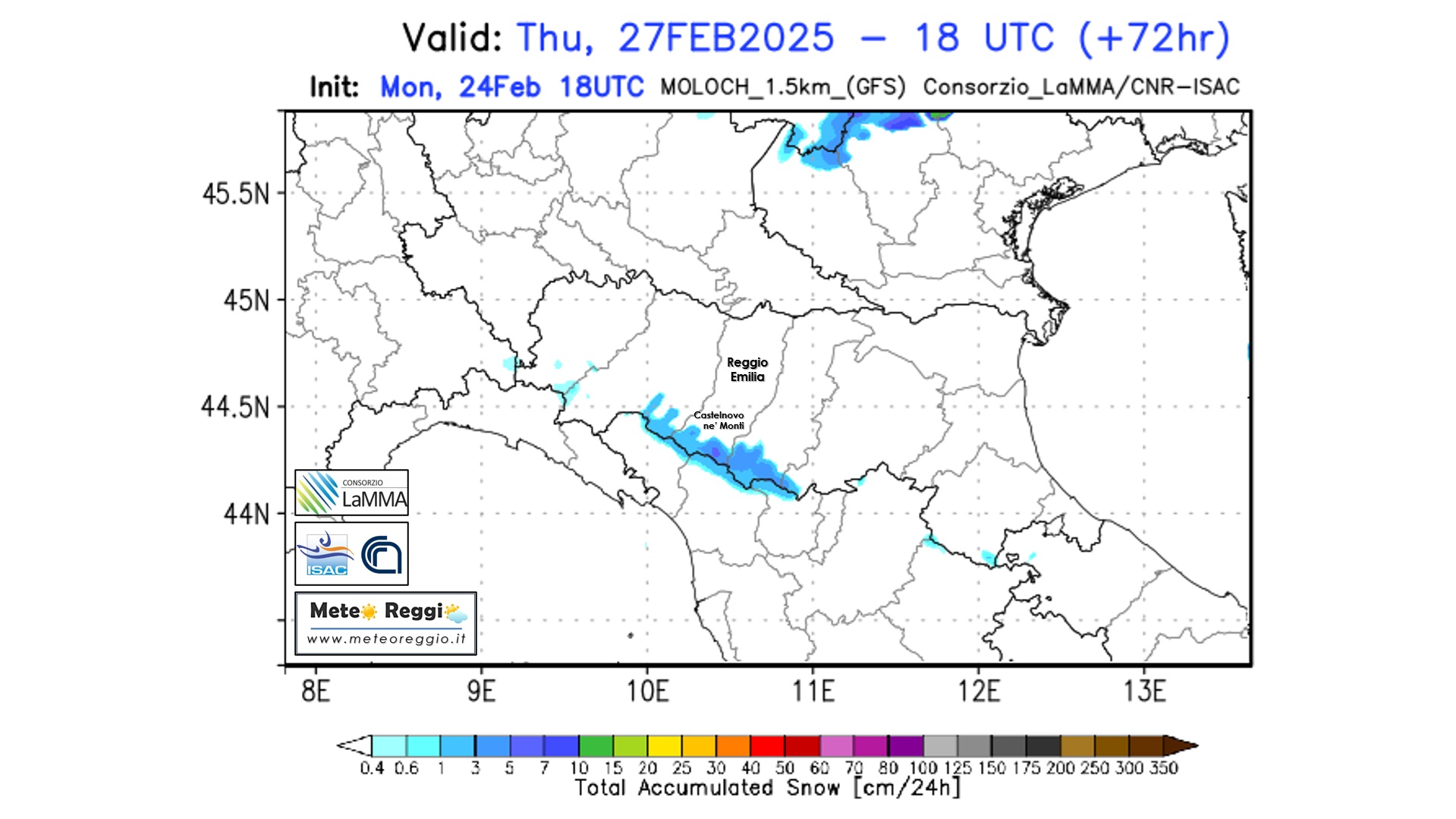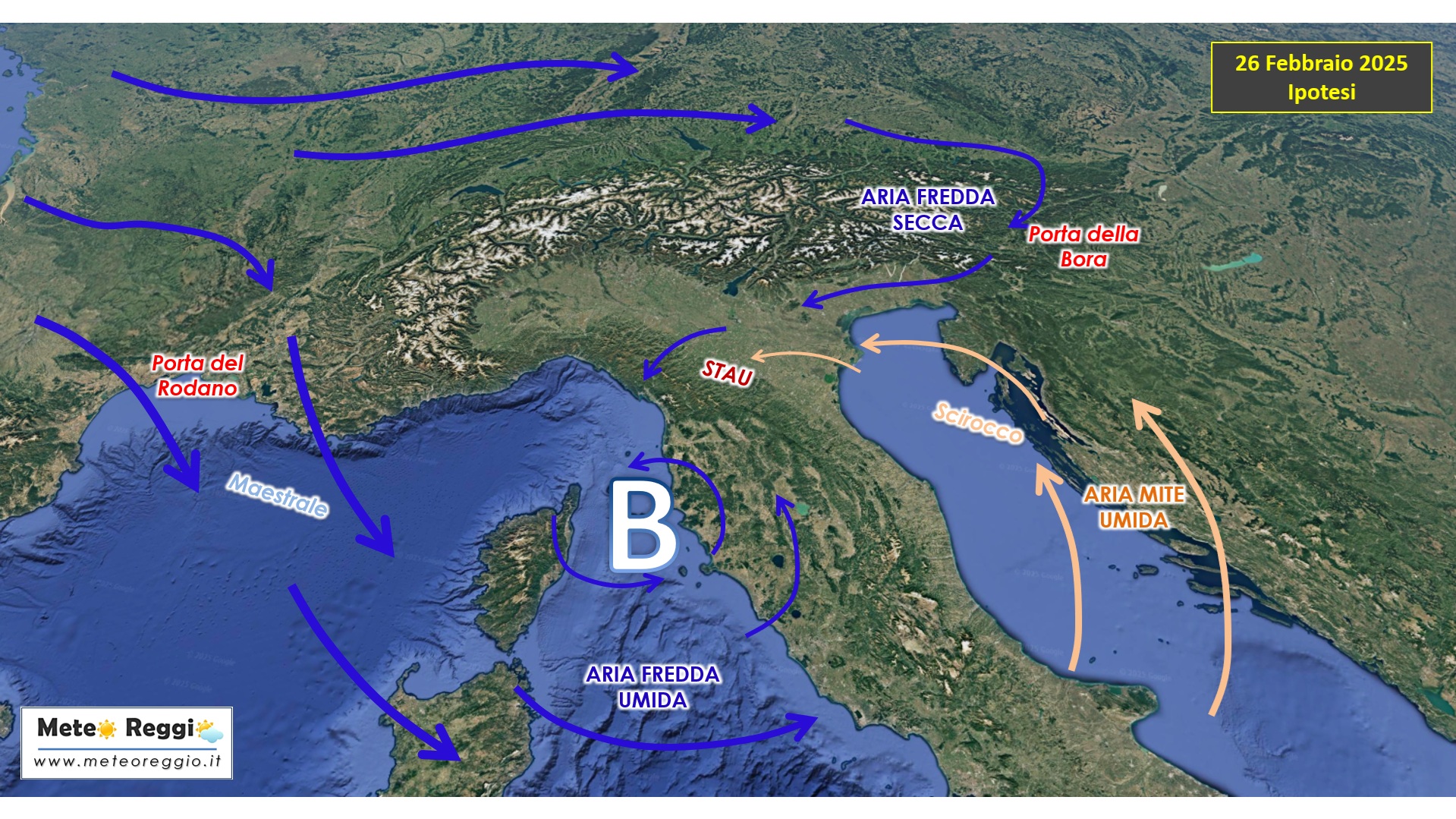 Mentre la Bora si farà strada da nord-est, la bassa pressione formatasi sul Tirreno richiamerà un flusso mite e umido dai quadranti sud-orientali. Lo Scirocco, proveniente dall'Adriatico, attraverserà un mare più caldo della norma, caricandosi di umidità e trovando un ostacolo naturale nell'Appennino reggiano. Questo scenario costituirà la ricetta perfetta per un muro di Stau, ovvero un effetto di sbarramento orografico che provocherà precipitazioni persistenti e copiose sull’intera provincia. In sostanza questo "trampolino naturale" forzerà la risalita della corrente di Scirocco verso l'alto entrando a contatto e mischiandosi con il vento freddo e secco di Bora. Le piogge inizieranno in mattinata e si intensificheranno nel corso della giornata, risultando costanti e con accumuli relativamente significativi. Pur non raggiungendo valori importanti, i quantitativi previsti saranno sufficienti a innescare possibili criticità idrogeologiche, a causa della saturazione del suolo come già visto nei recenti episodi perturbati dell’8 dicembre 2024 e del 14 febbraio 2025.