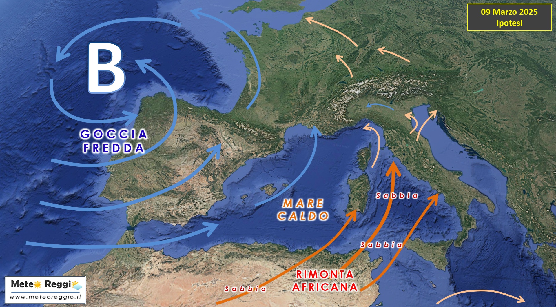 Le giornate di venerdì 07 e sabato 08 saranno giornate ancora segnate dalla presenza dell'anticiclone, che seppure in allontanamento ancora ci fa sentire i suoi influssi. Due giornate soleggiate sebbene in progressivo impallidimento per l'ingresso di flussi d'aria umida in altissima quota. Flussi che porteranno in dote scie di condensazione in alta quota ma nessuna minaccia di precipitazioni. Ma le minacce si concretizzeranno dalla giornata di domenica 09 marzo quando una goccia d'aria fredda scenderà sulla penisola iberica assumendo connotati ciclonici di bassa pressione. Questo vortice ingombrante che ruoterà in senso antiorario richiamerà verso il Mediterraneo una forte corrente d'aria calda dal nord Africa.