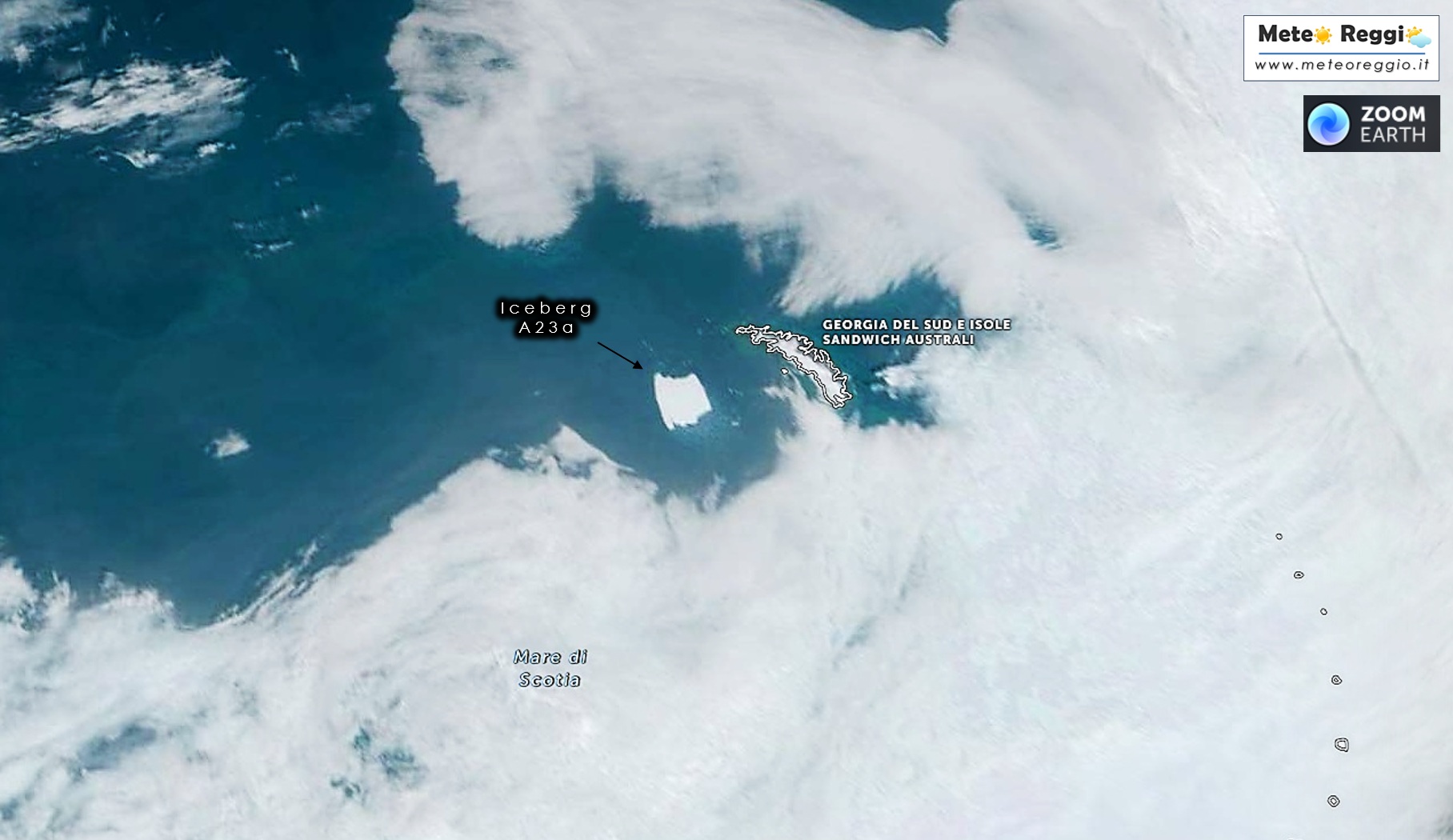 Nel mese di gennaio vi abbiamo dato notizia (vedi link) di un grande iceberg alla deriva nell'oceano antartico. Un gigantesco blocco di ghiaccio che vaga da anni e che dopo un lungo periodo di incertezza si era rimesso in moto a grande velocità. Da allora il nostro A23a si è diretto a gran velocità verso l'isola Georgia del Sud e dall'inizio del mese di marzo si è incagliato davanti alle coste dell'isola.